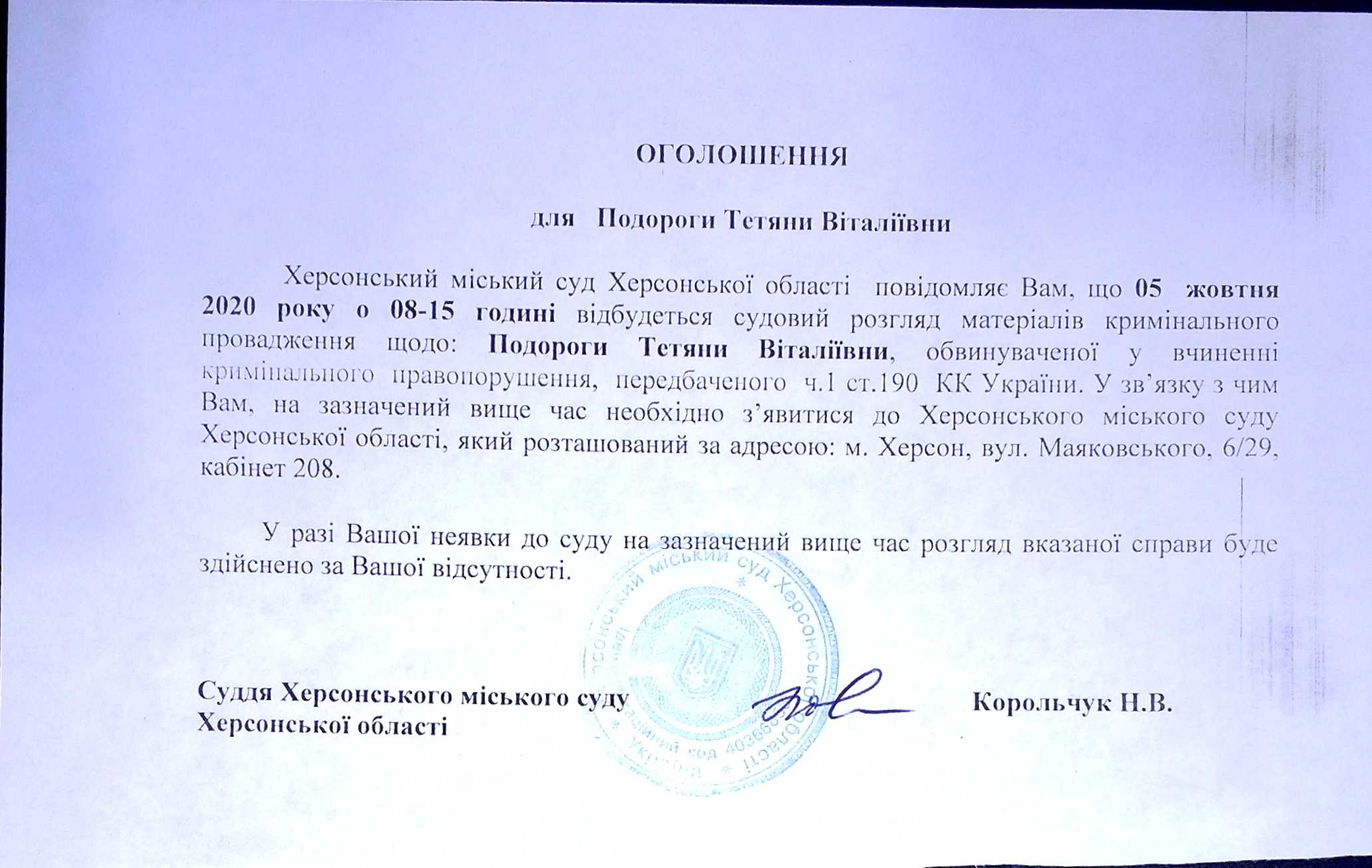 ОГОЛОШЕННЯ ПРО ВИКЛИК ДО СУДУ