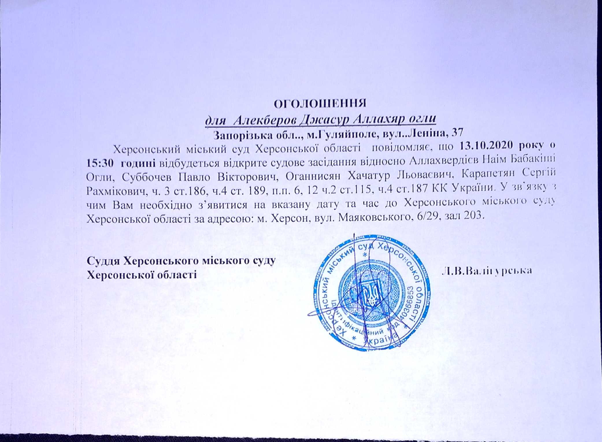 ОГОЛОШЕННЯ для Алекберова Джасур Аллахяр огли