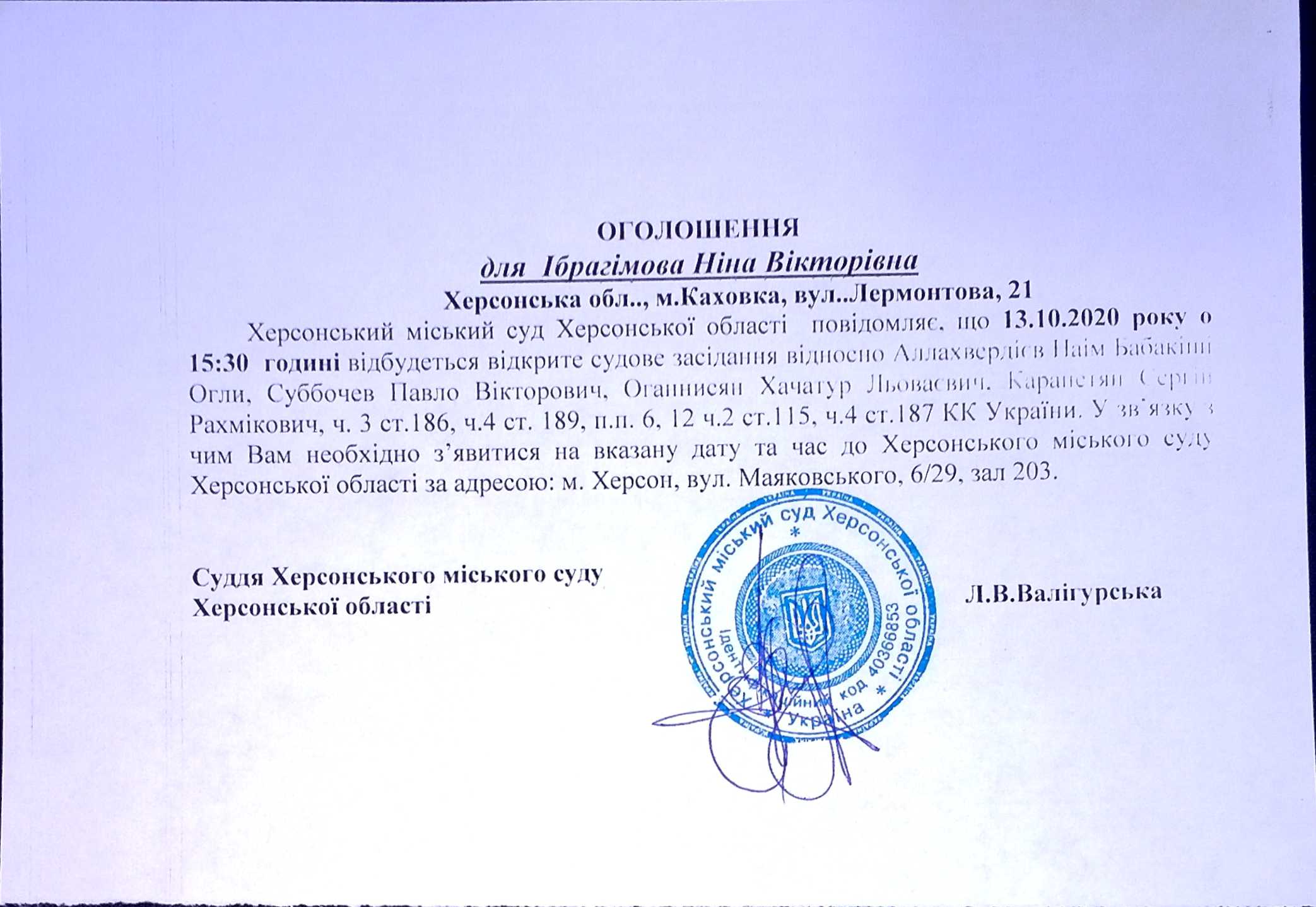ОГОЛОШЕННЯ для Ібрагімової Ніни Вікторівни
