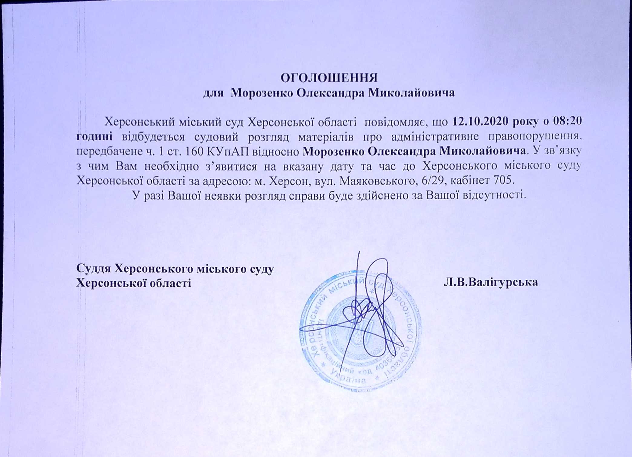 ОГОЛОШЕННЯ для Морозенко Олександра Миколайовича
