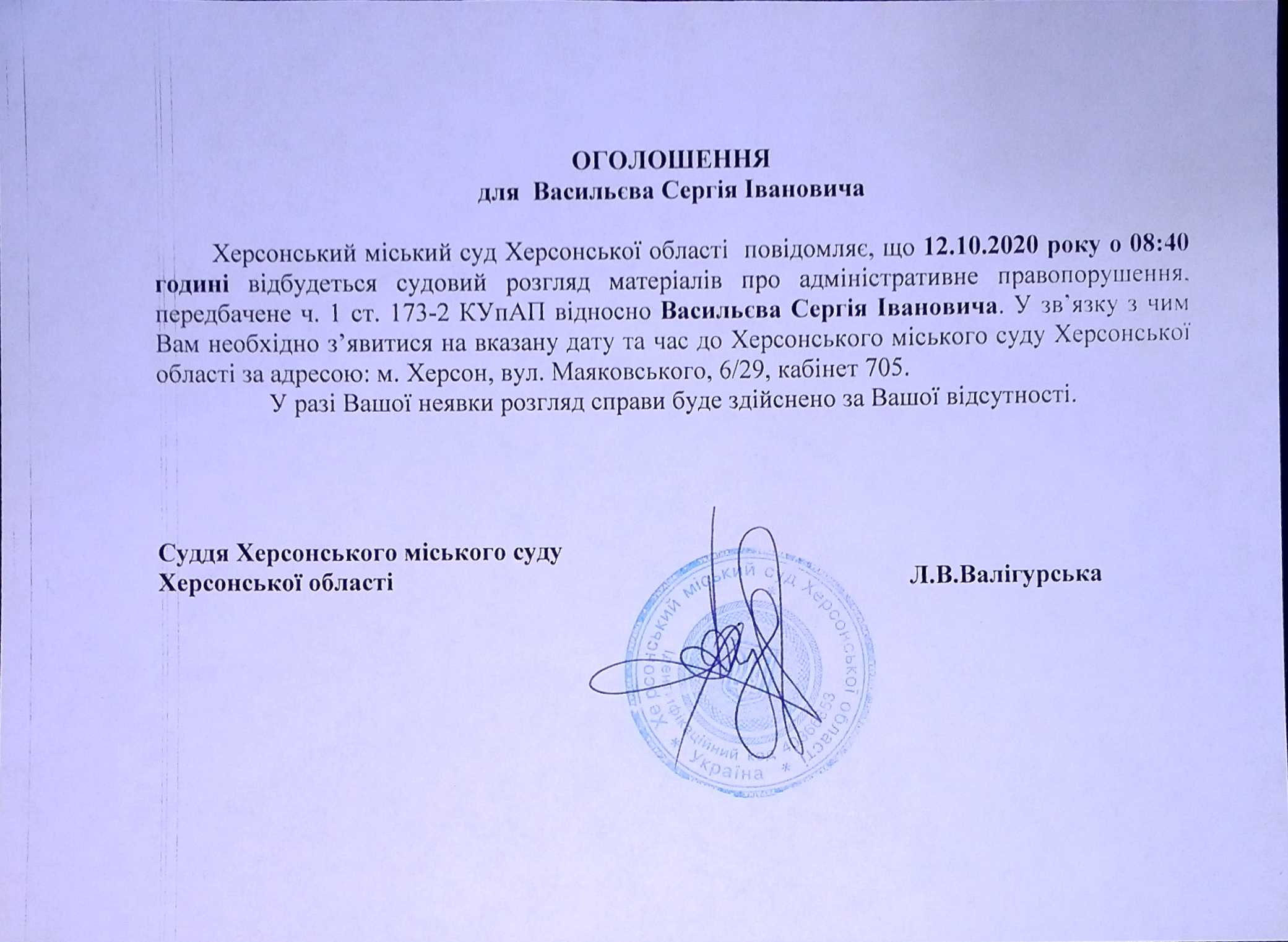 ОГОЛОШЕННЯ для Васильєва Сергія Івановича