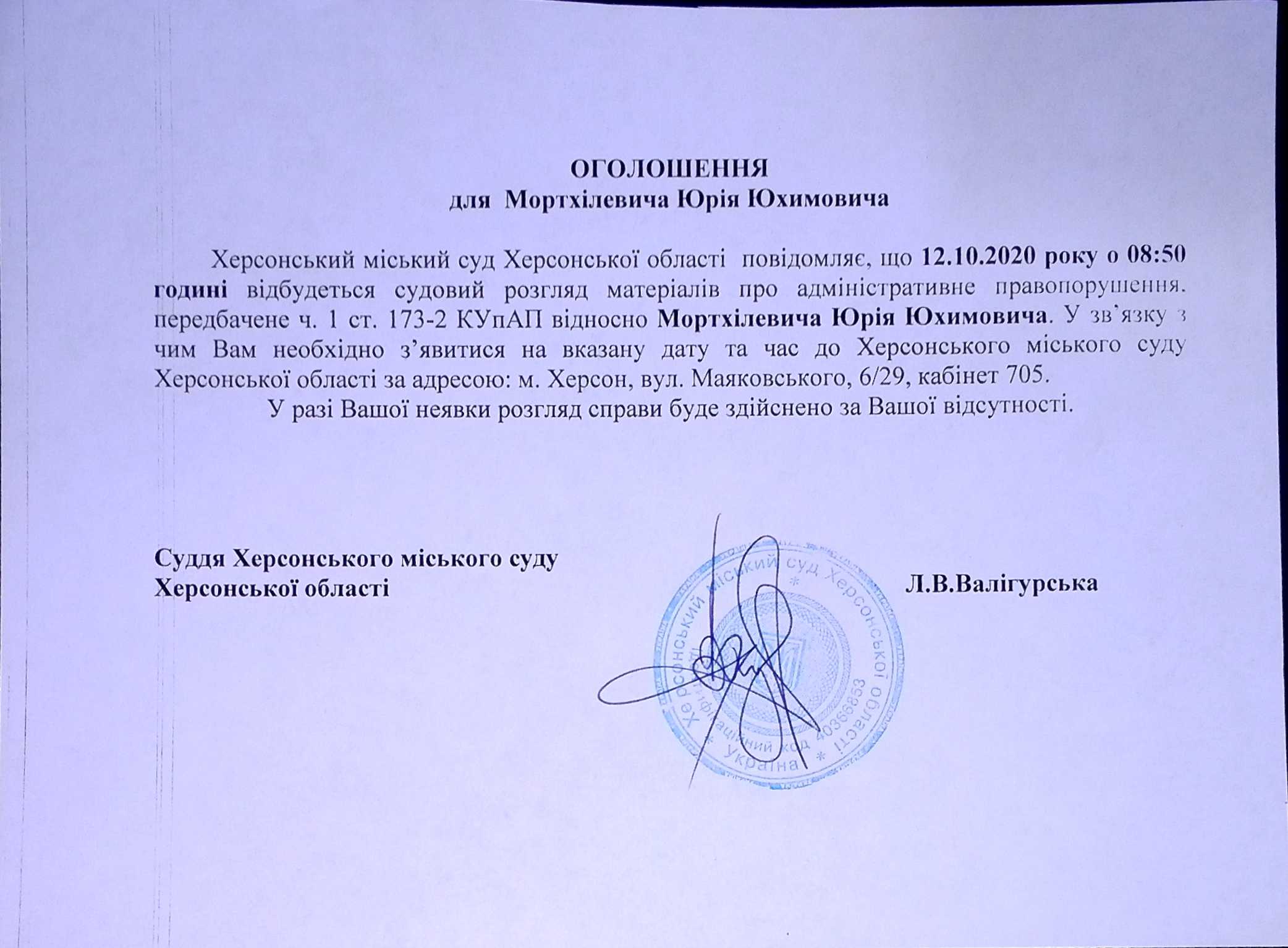 ОГОЛОШЕННЯ для Мортхілевича Юрія Юхимовича