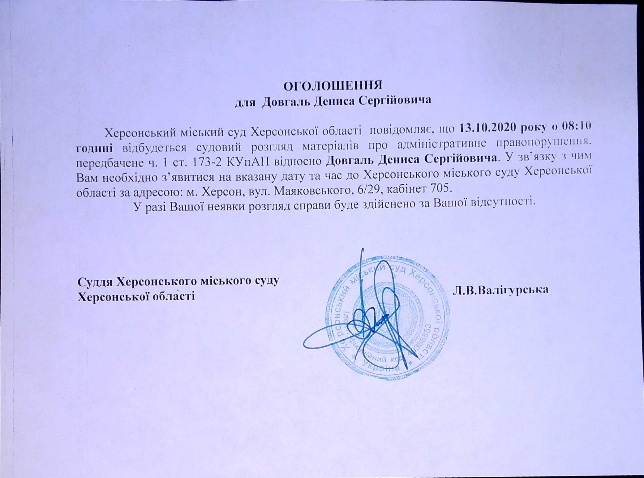 ОГОЛОШЕННЯ для Довгаль Дениса Сергійовича