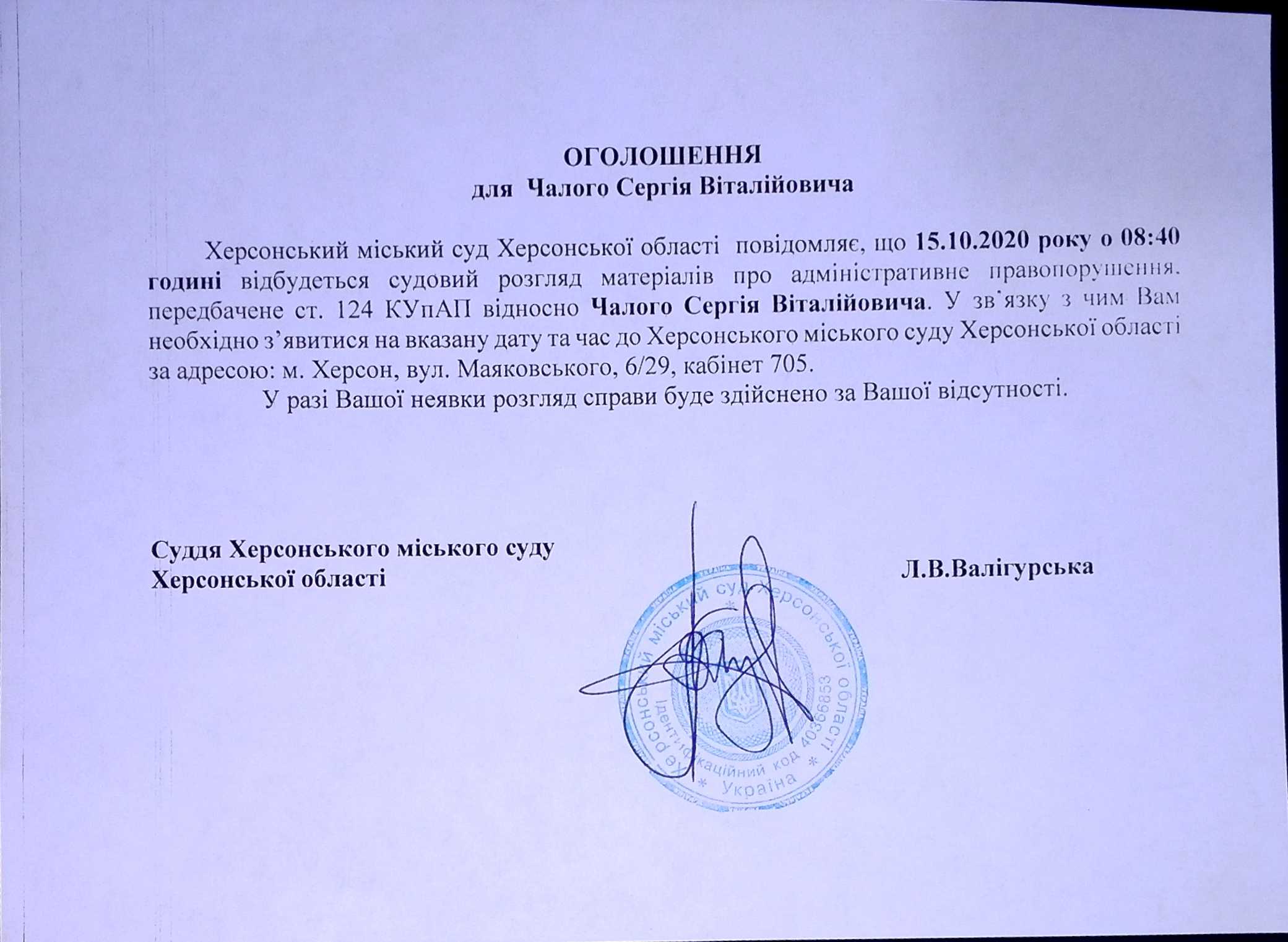 ОГОЛОШЕННЯ для Чалого Сергія Віталійовича