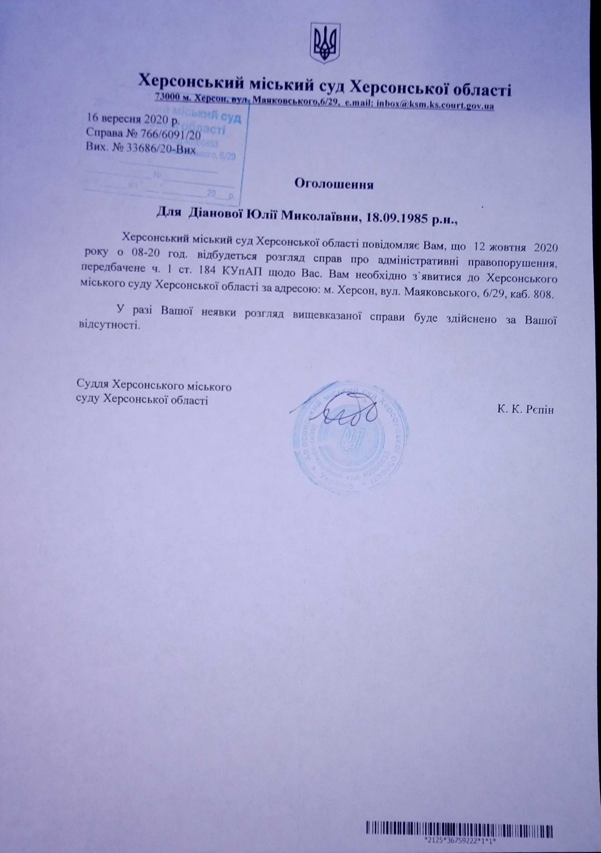 ОГОЛОШЕННЯ для Діанової Юлії Миколаївни