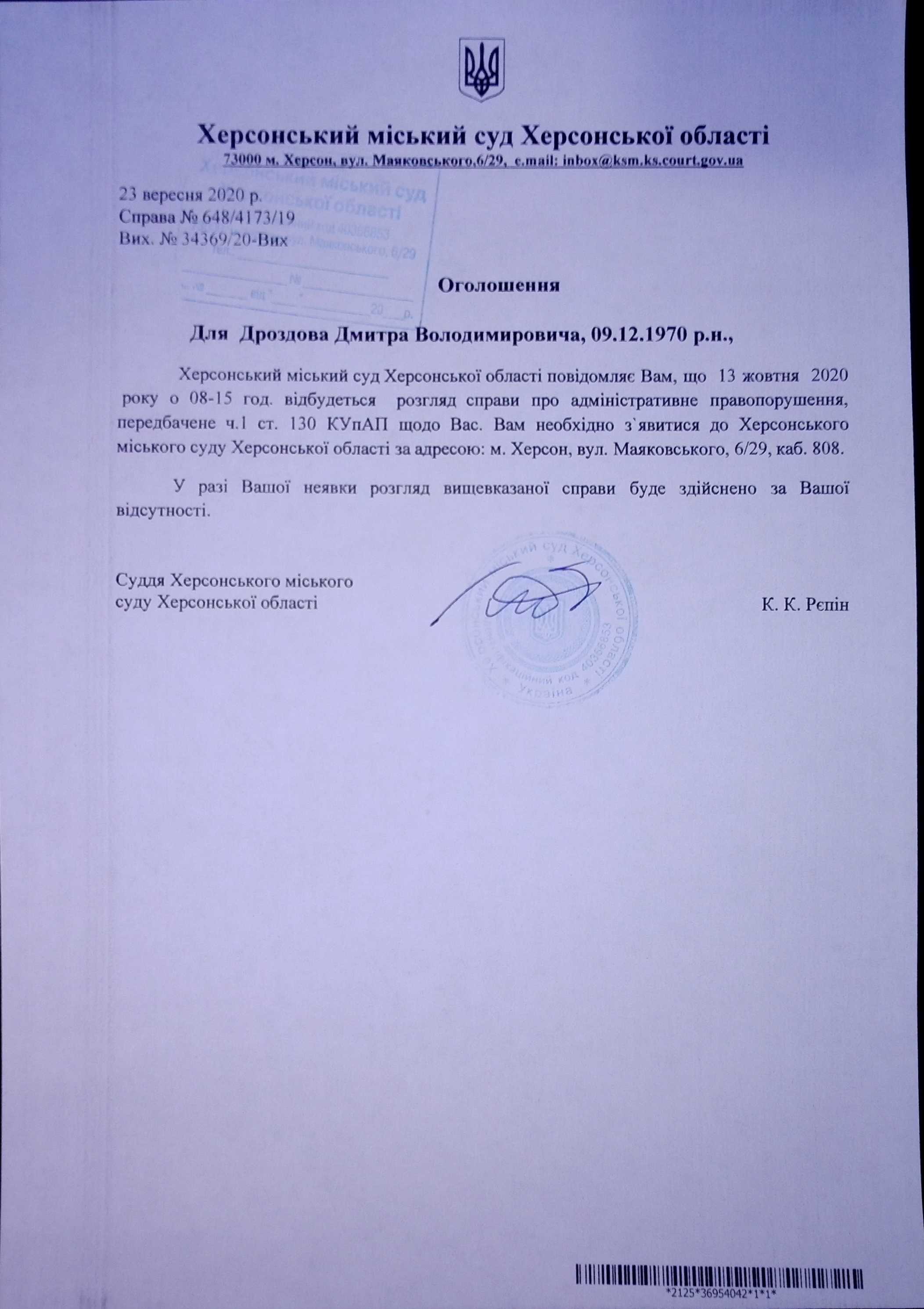 ОГОЛОШЕННЯ для Дроздова Дмитра Володимировича