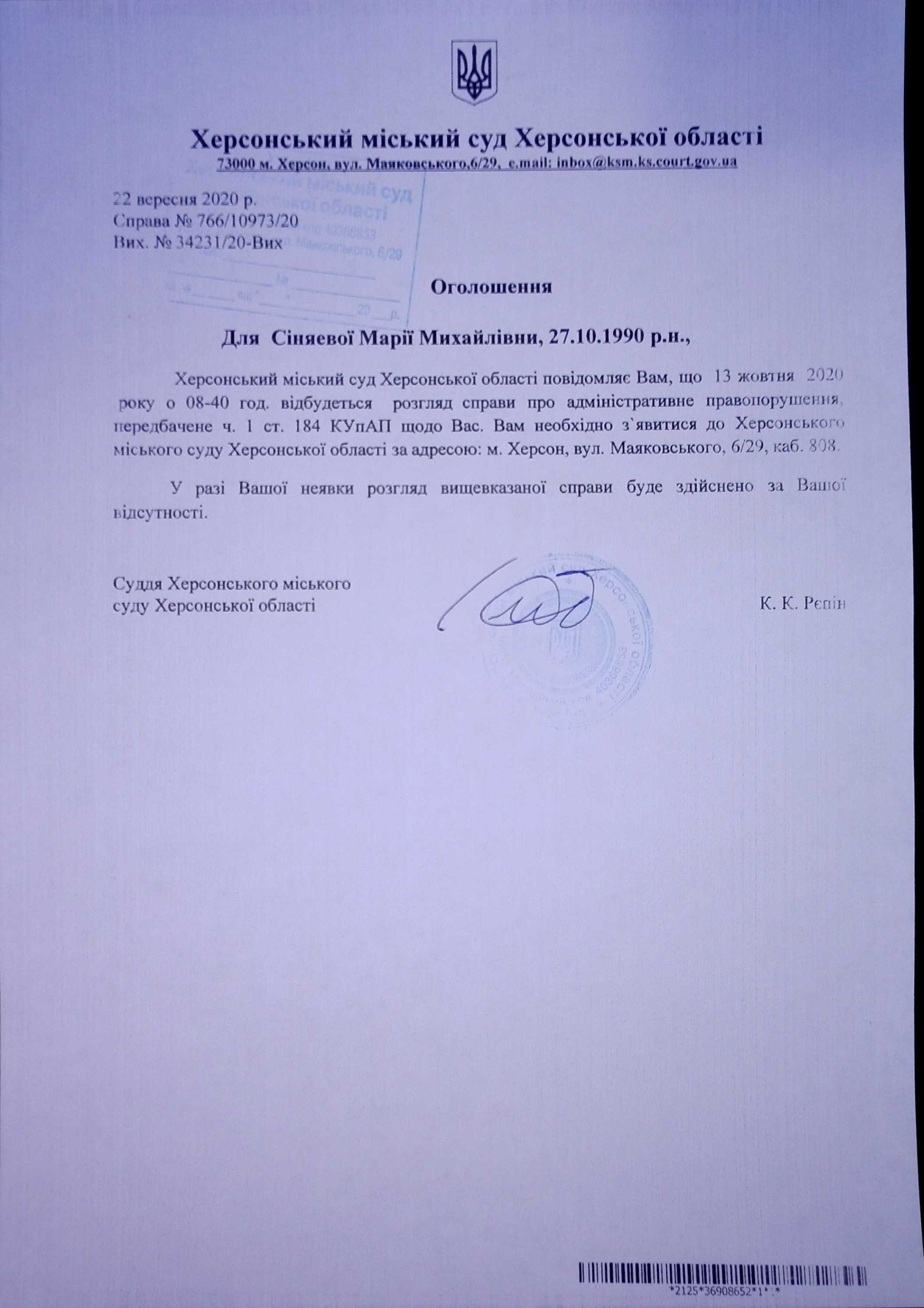 ОГОЛОШЕННЯ для Сіняєвої Марії Михайлівни