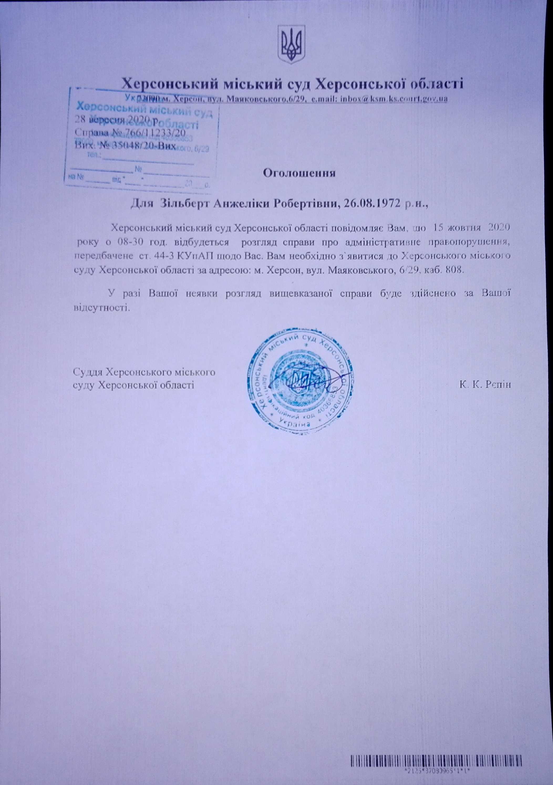 ОГОЛОШЕННЯ для Зільберт Анжеліки Робертівни