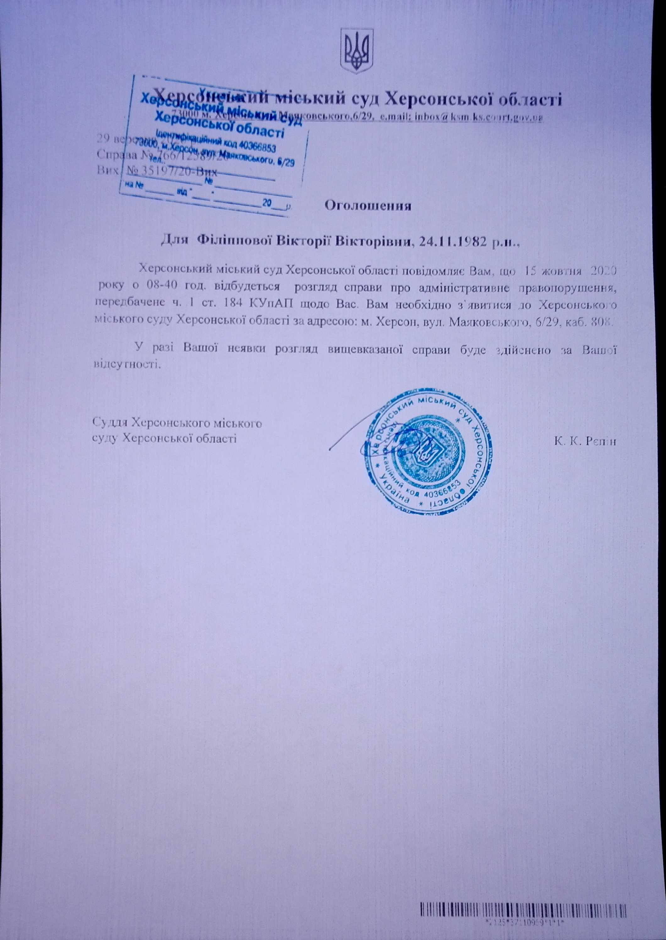 ОГОЛОШЕННЯ для Філіппової Вікторії Вікторівни