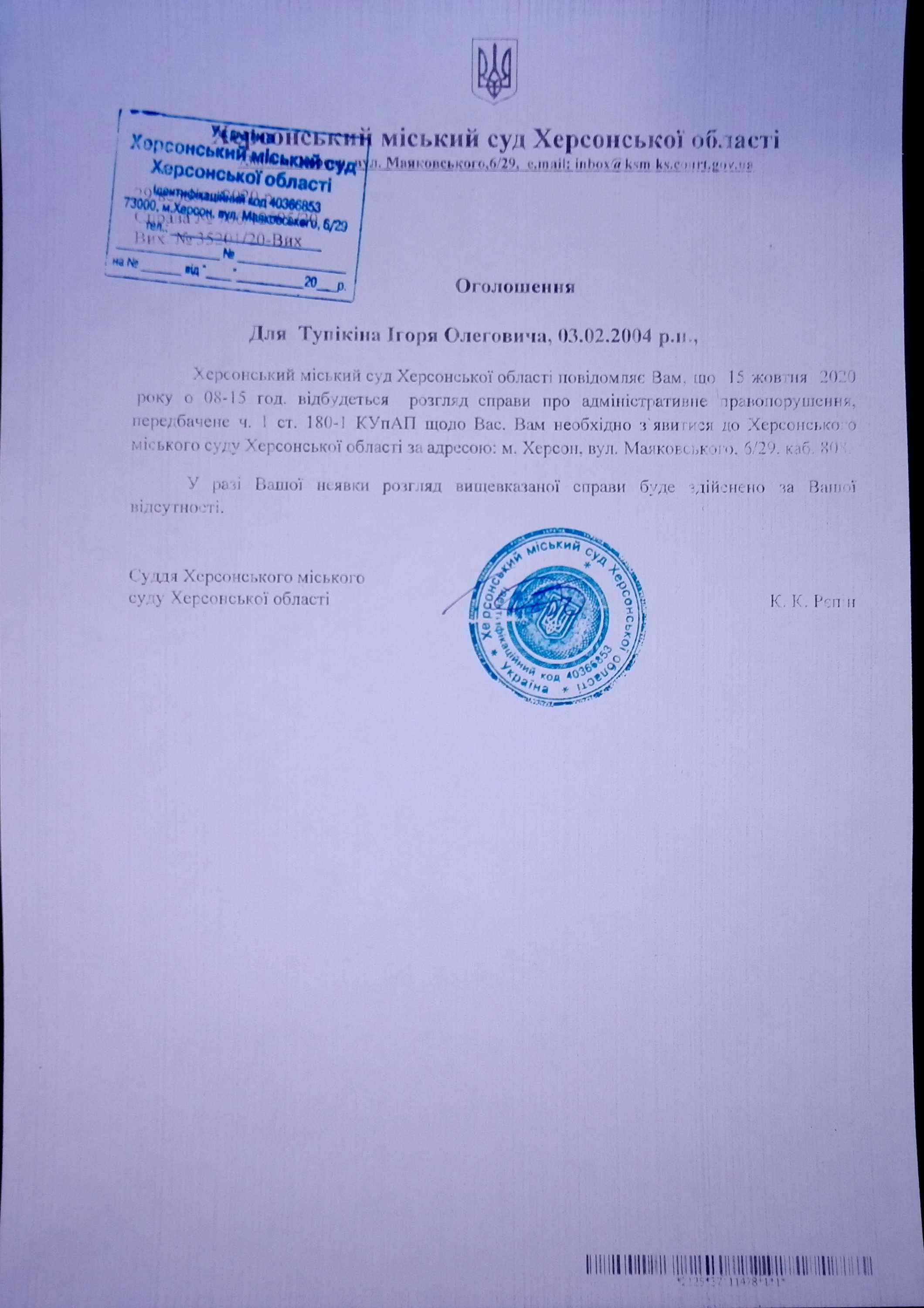 ОГОЛОШЕННЯ для Тупікіна Ігоря Олеговича