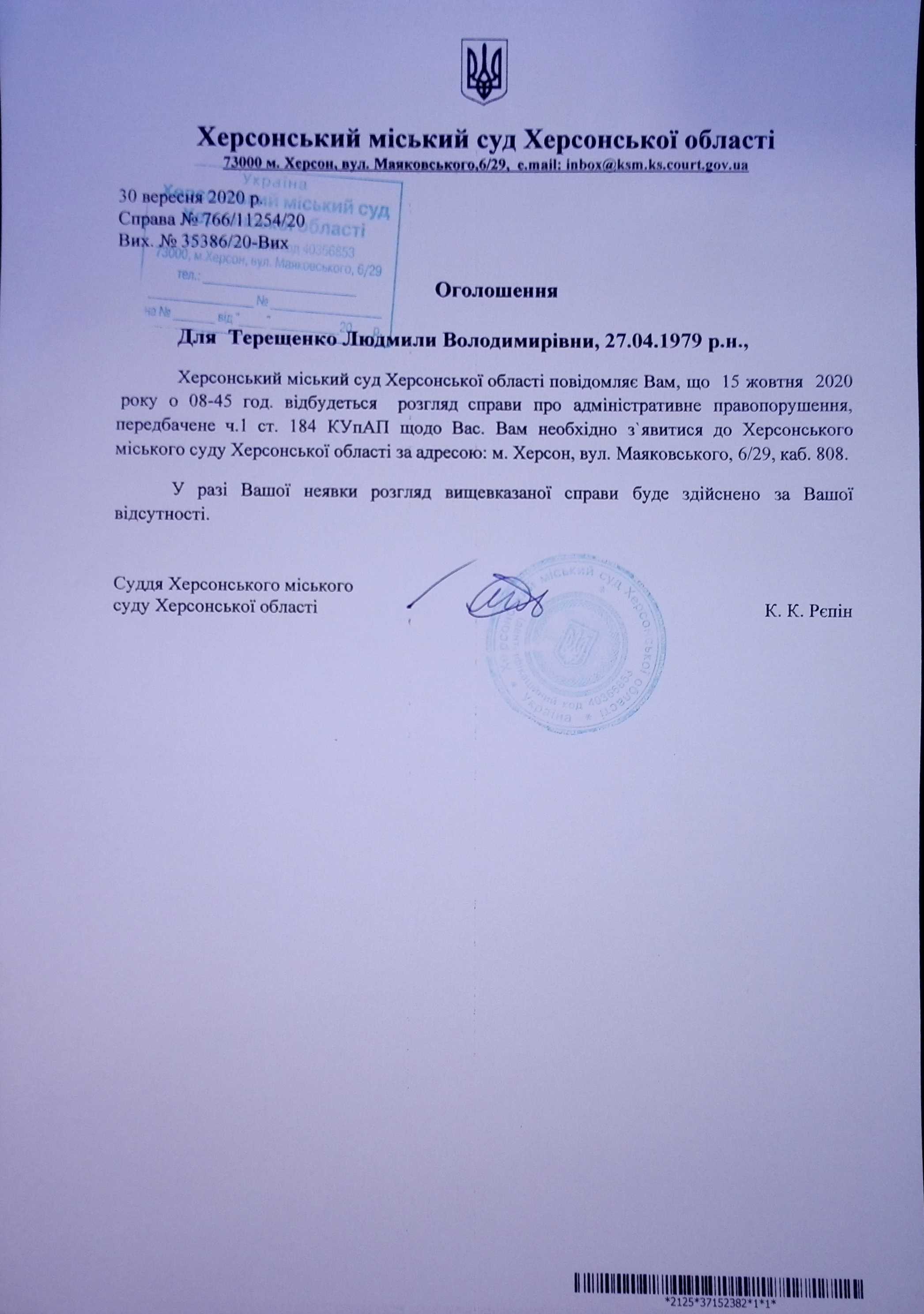 ОГОЛОШЕННЯ для Терещенко Людмили Володимирівни