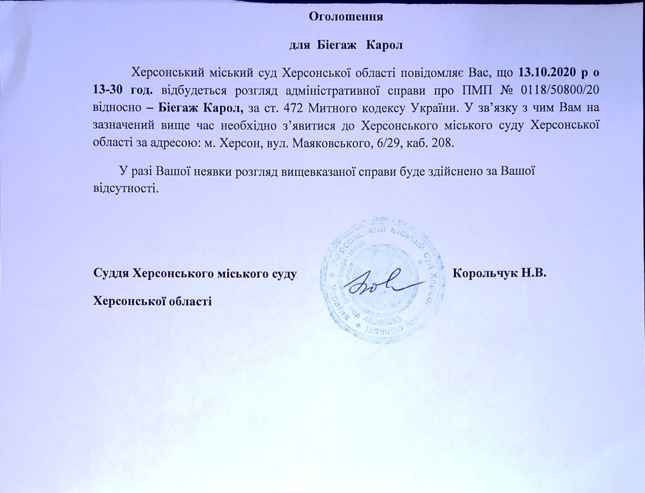 ОГОЛОШЕННЯ ПРО ВИКЛИК ДО СУДУ