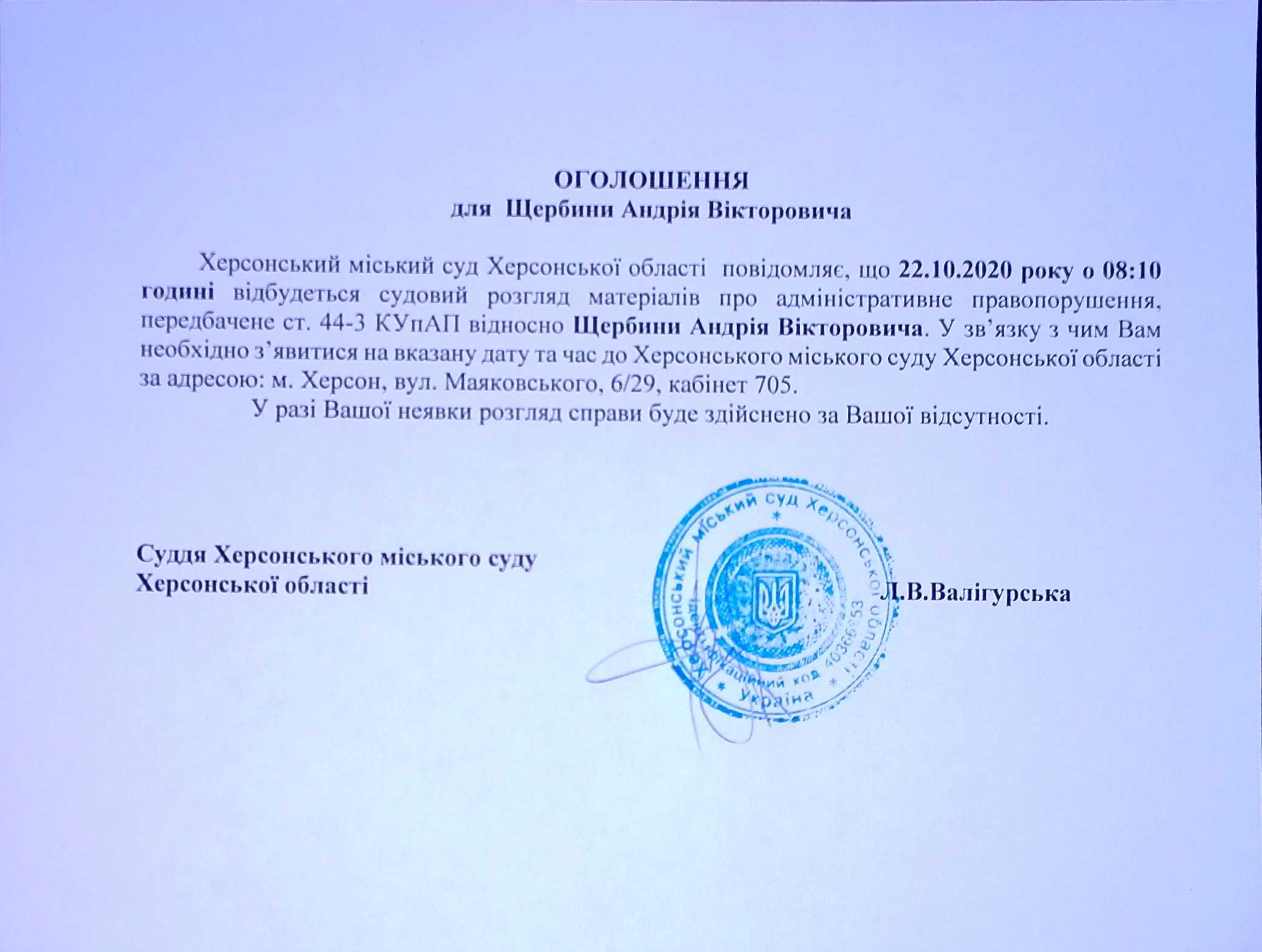 ОГОЛОШЕННЯ для Щербини Андрія Вікторовича