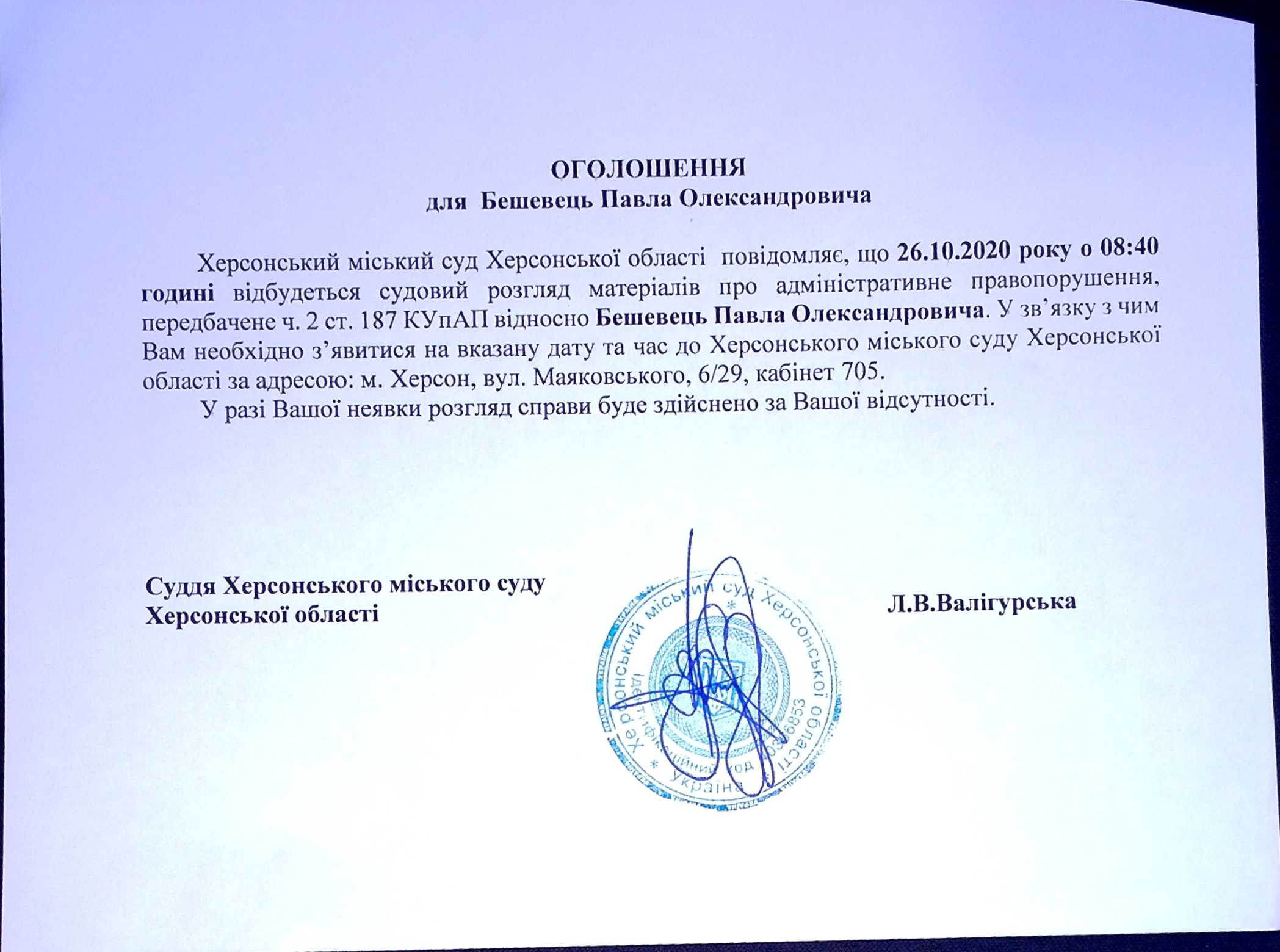 ОГОЛОШЕННЯ для Бешевець Павла Олександровича