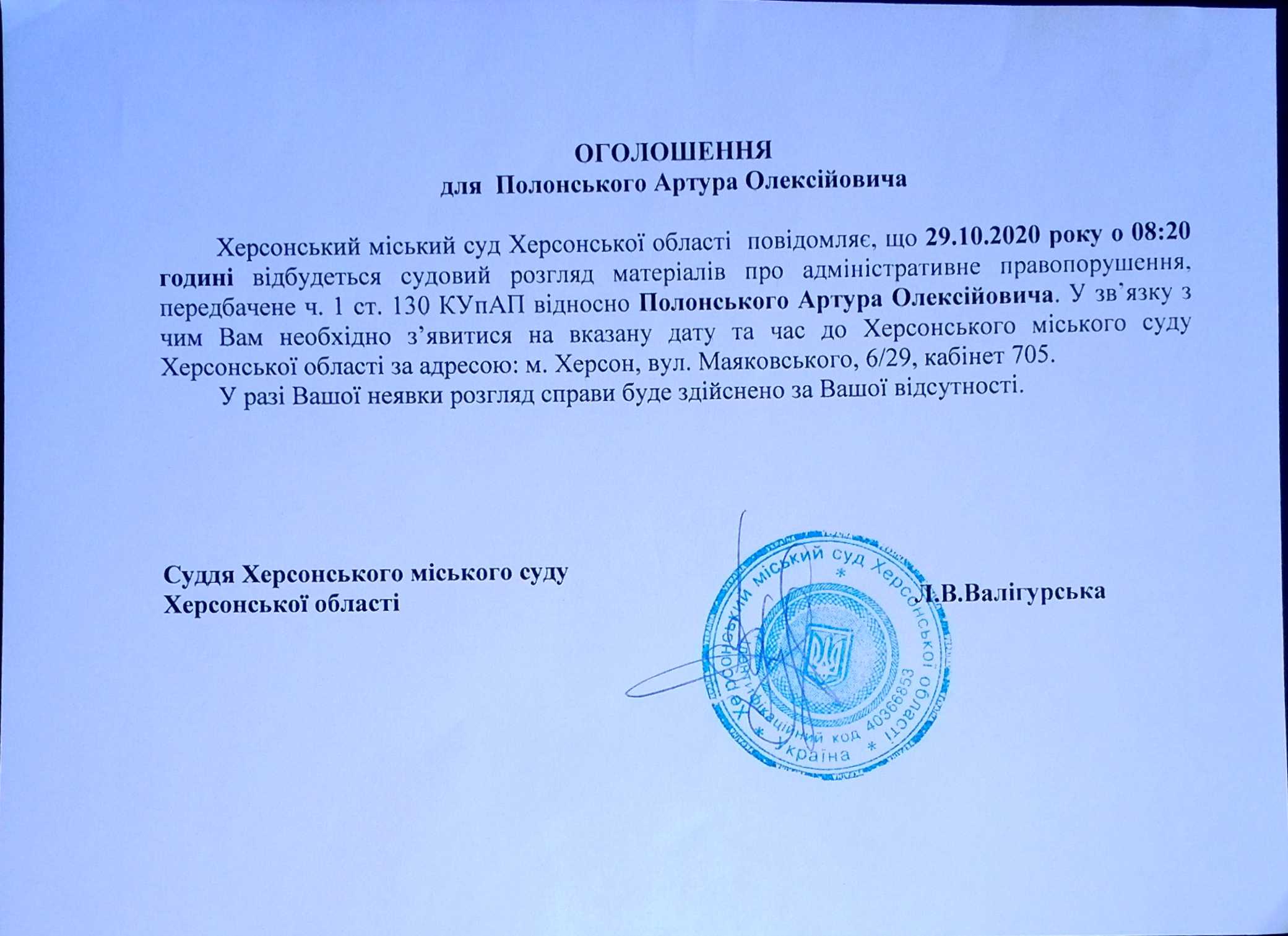 ОГОЛОШЕННЯ для Полонського Артура Олексійовича