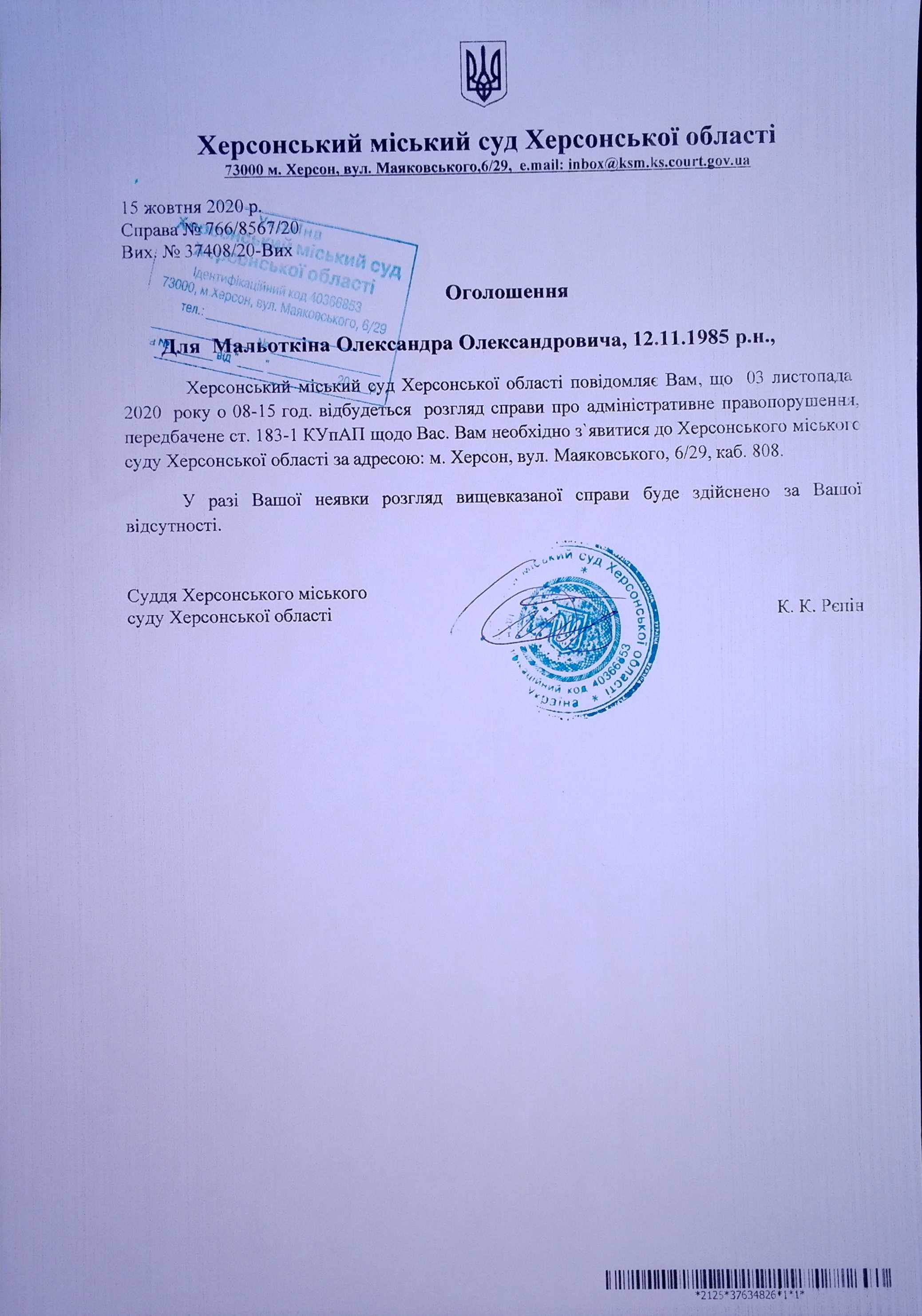 ОГОЛОШЕННЯ для Мальоткіна Олександра Олександровича