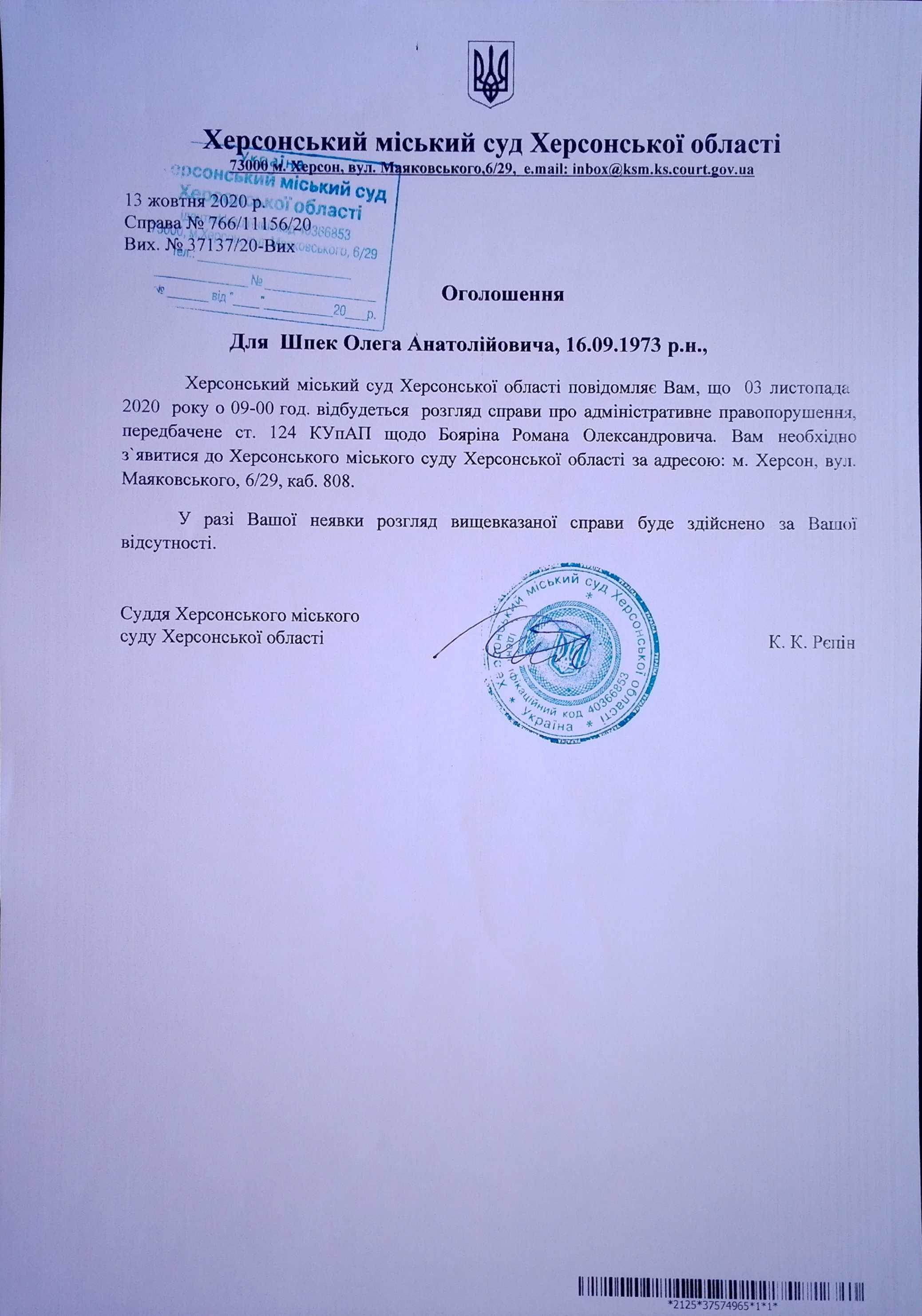 ОГОЛОШЕННЯ для Шпек Олега Анатолійовича