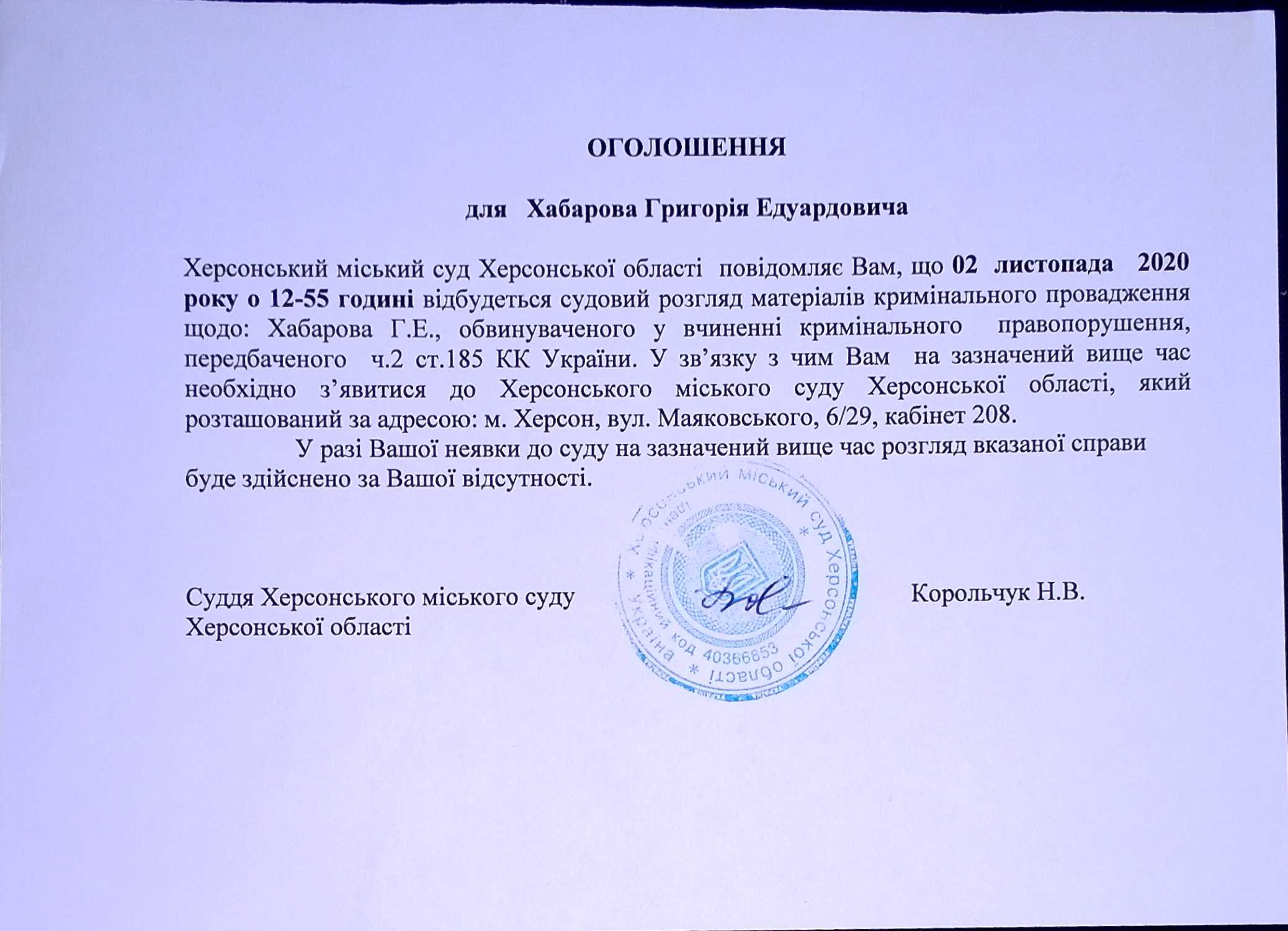ОГОЛОШЕННЯ для Хабарова Григорія Едуардовича