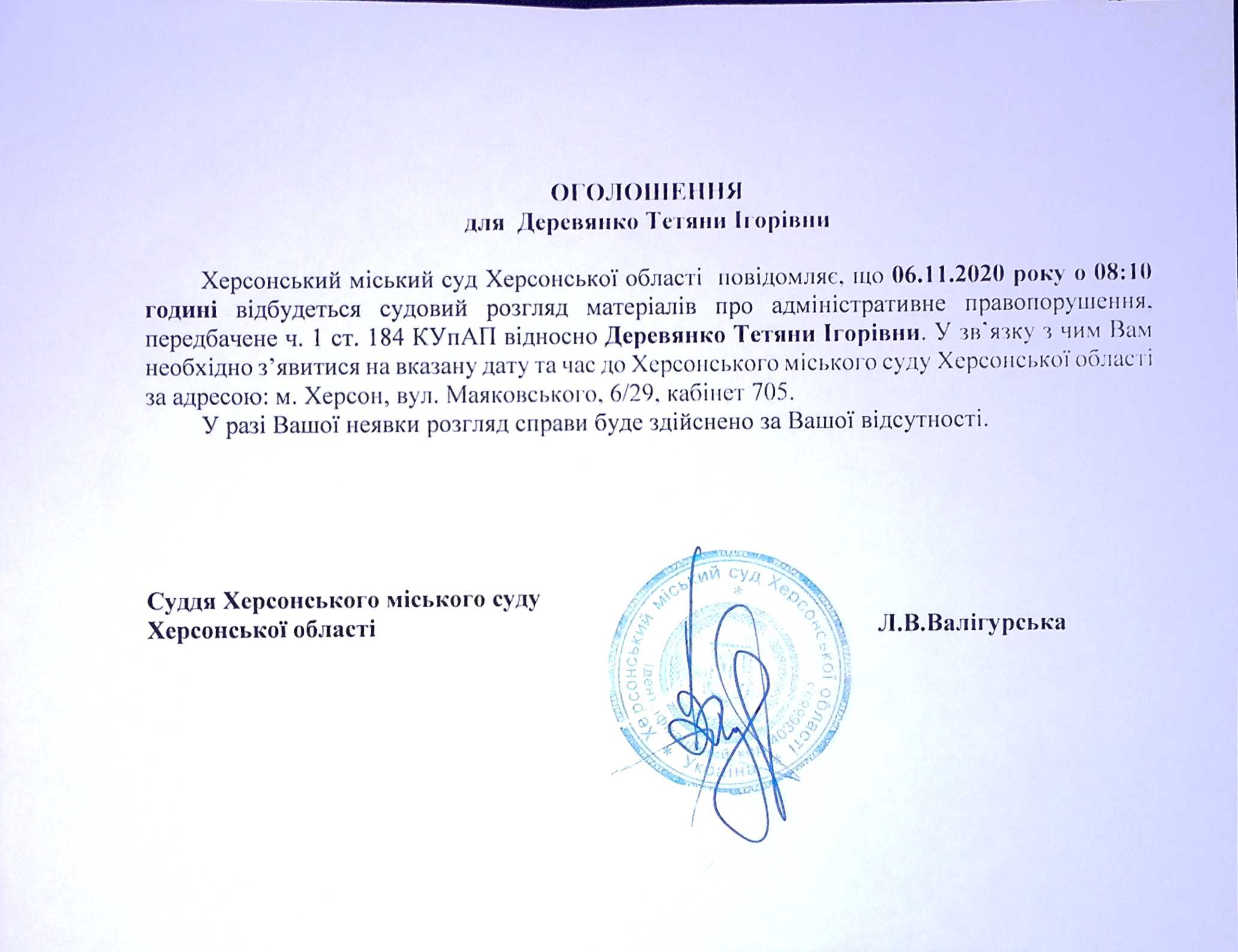 ОГОЛОШЕННЯ для Деревянко Тетяни Ігорівни