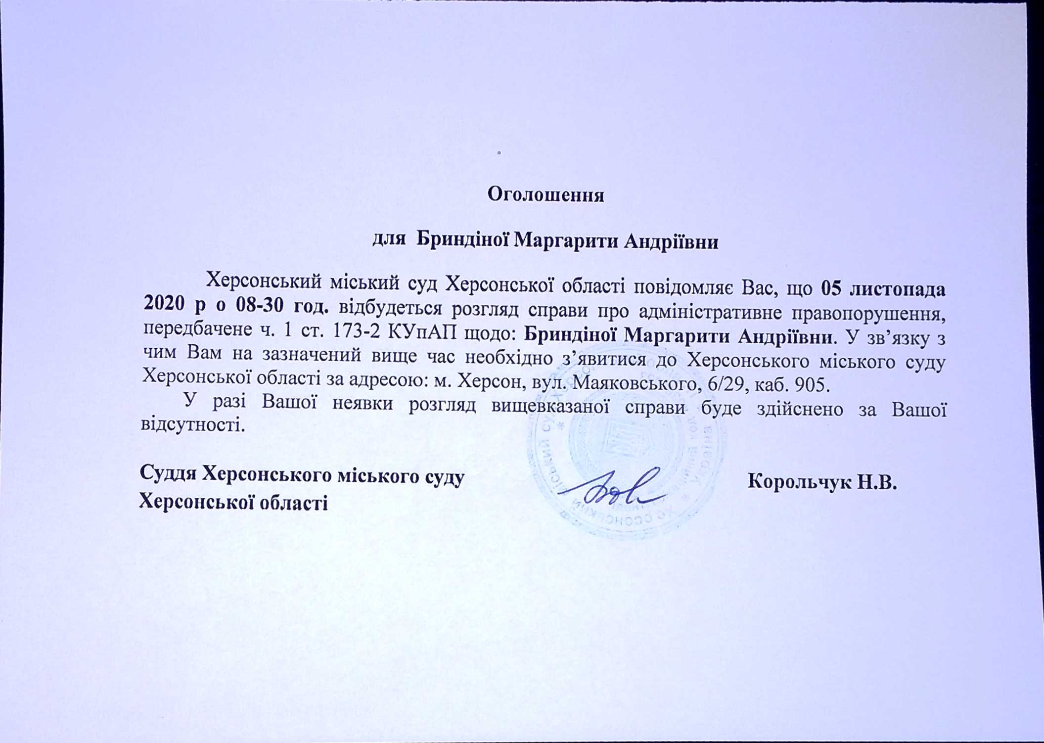 ОГОЛОШЕННЯ ПРО ВИКЛИК ДО СУДУ