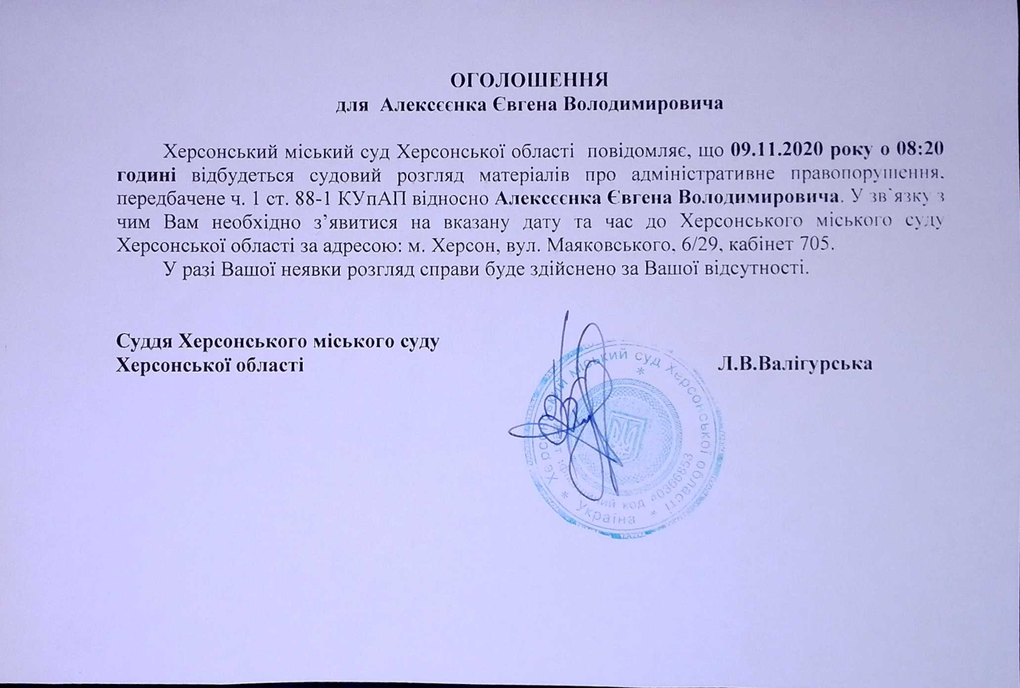 ОГОЛОШЕННЯ ПРО ВИКЛИК ДО СУДУ