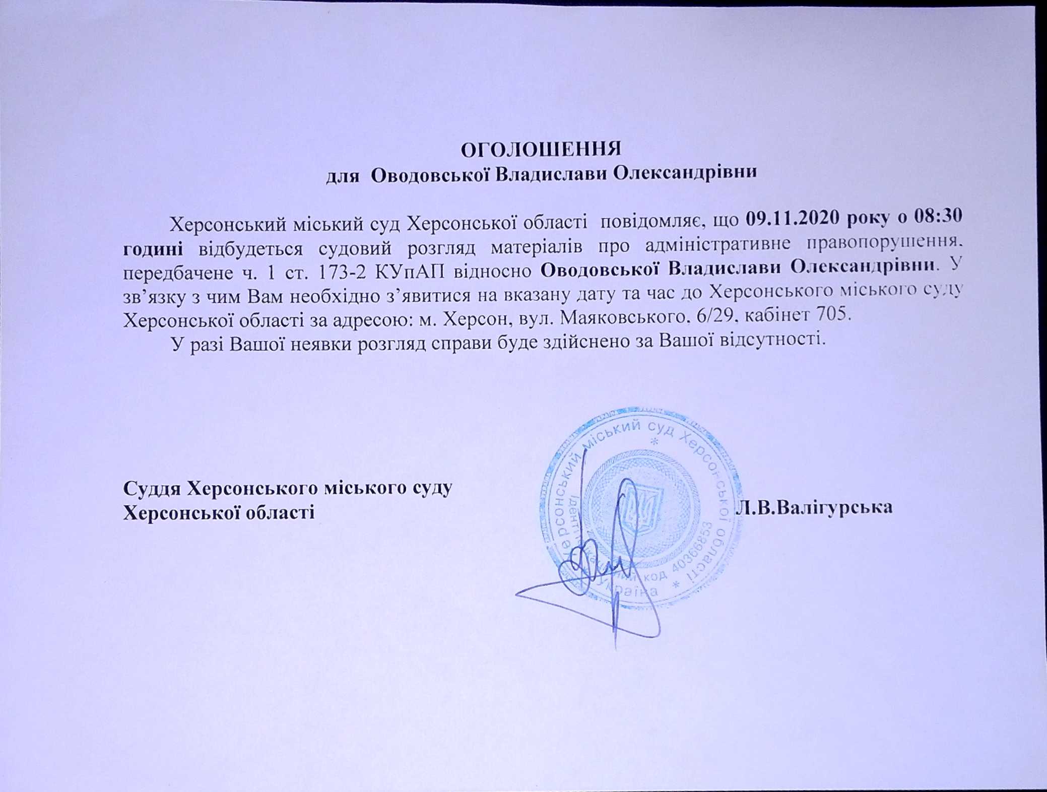 ОГОЛОШЕННЯ для Оводовської Владислави Олександрівни
