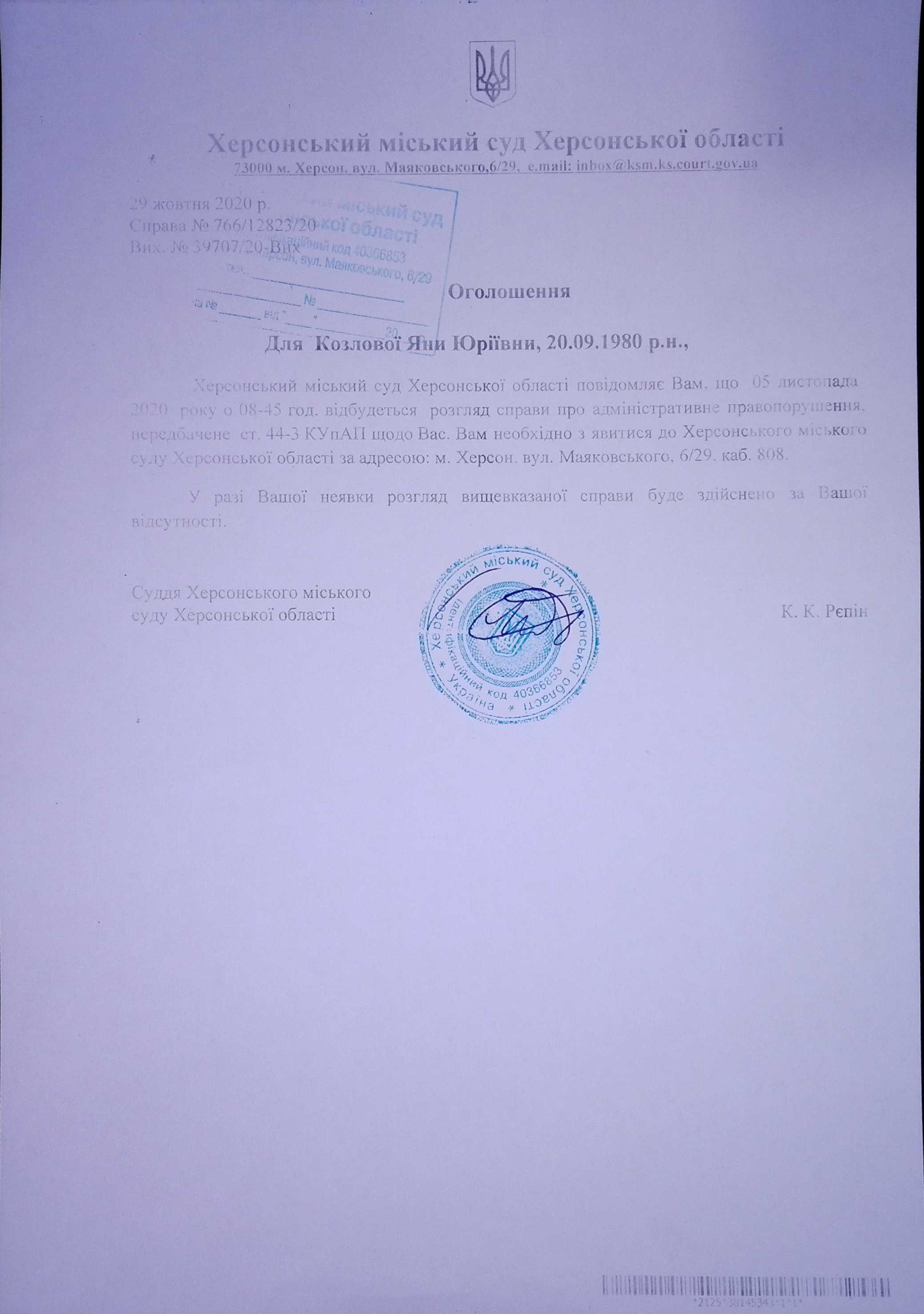 ОГОЛОШЕННЯ для Козлової Яни Юріївни