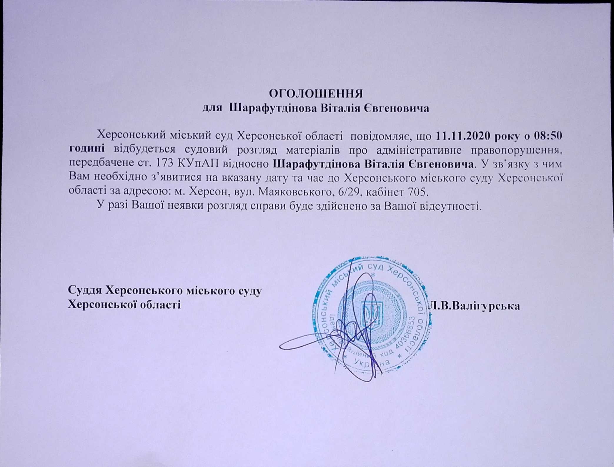 ОГОЛОШЕННЯ для Шарафутдінова Віталія Євгеновича