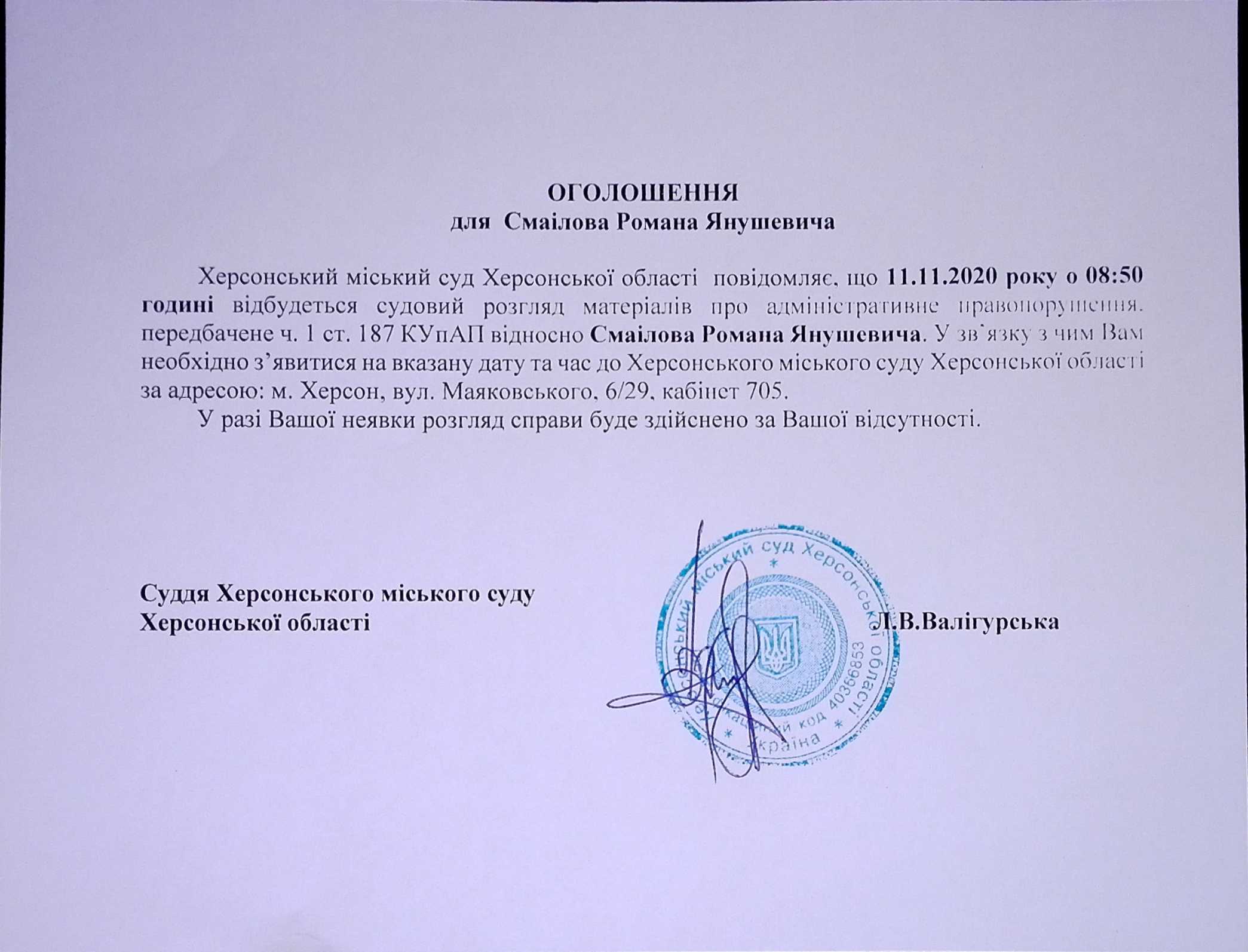 ОГОЛОШЕННЯ для Смаілова Романа Янушевича