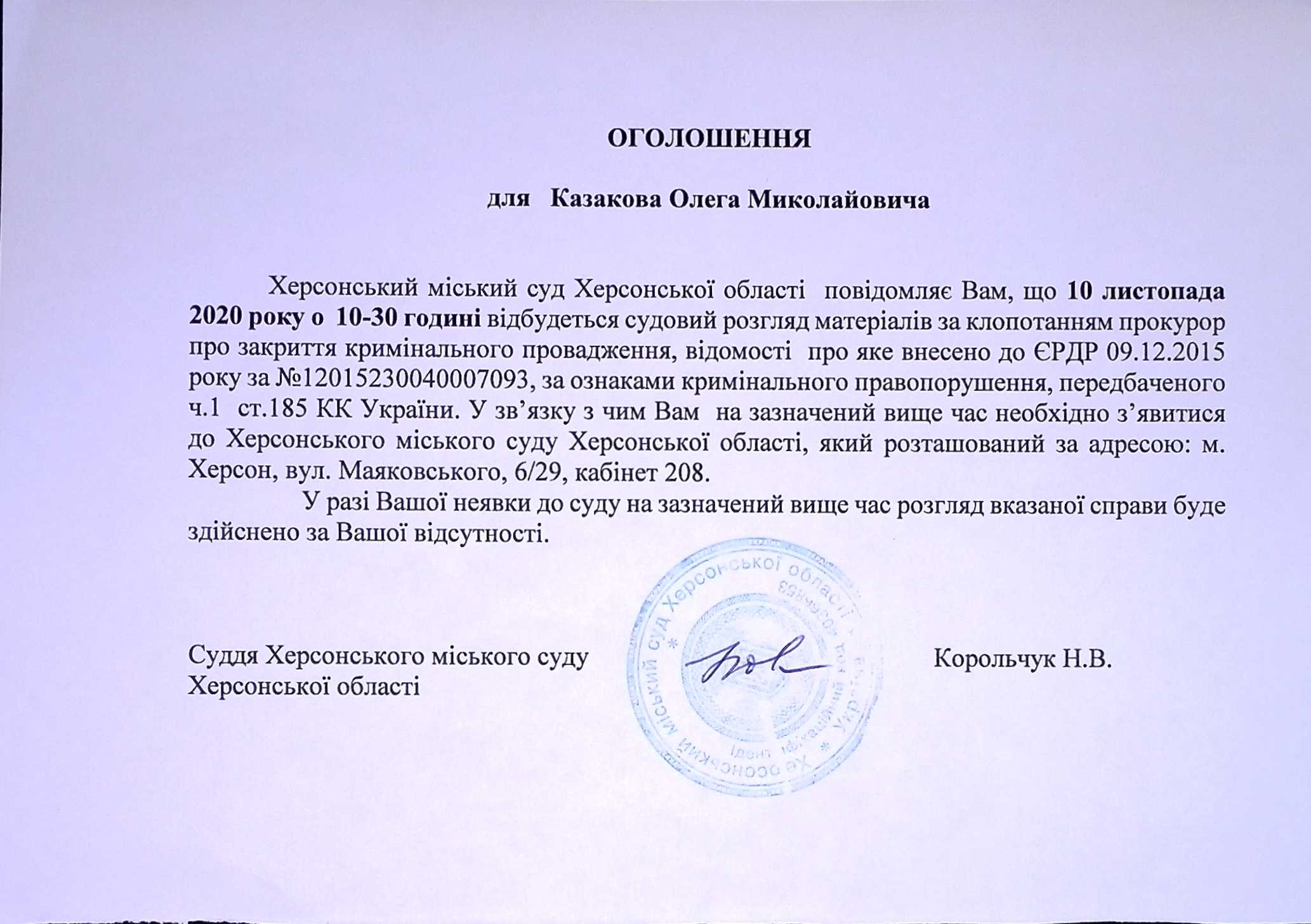 ОГОЛОШЕННЯ для Казакова Олега Миколайовича