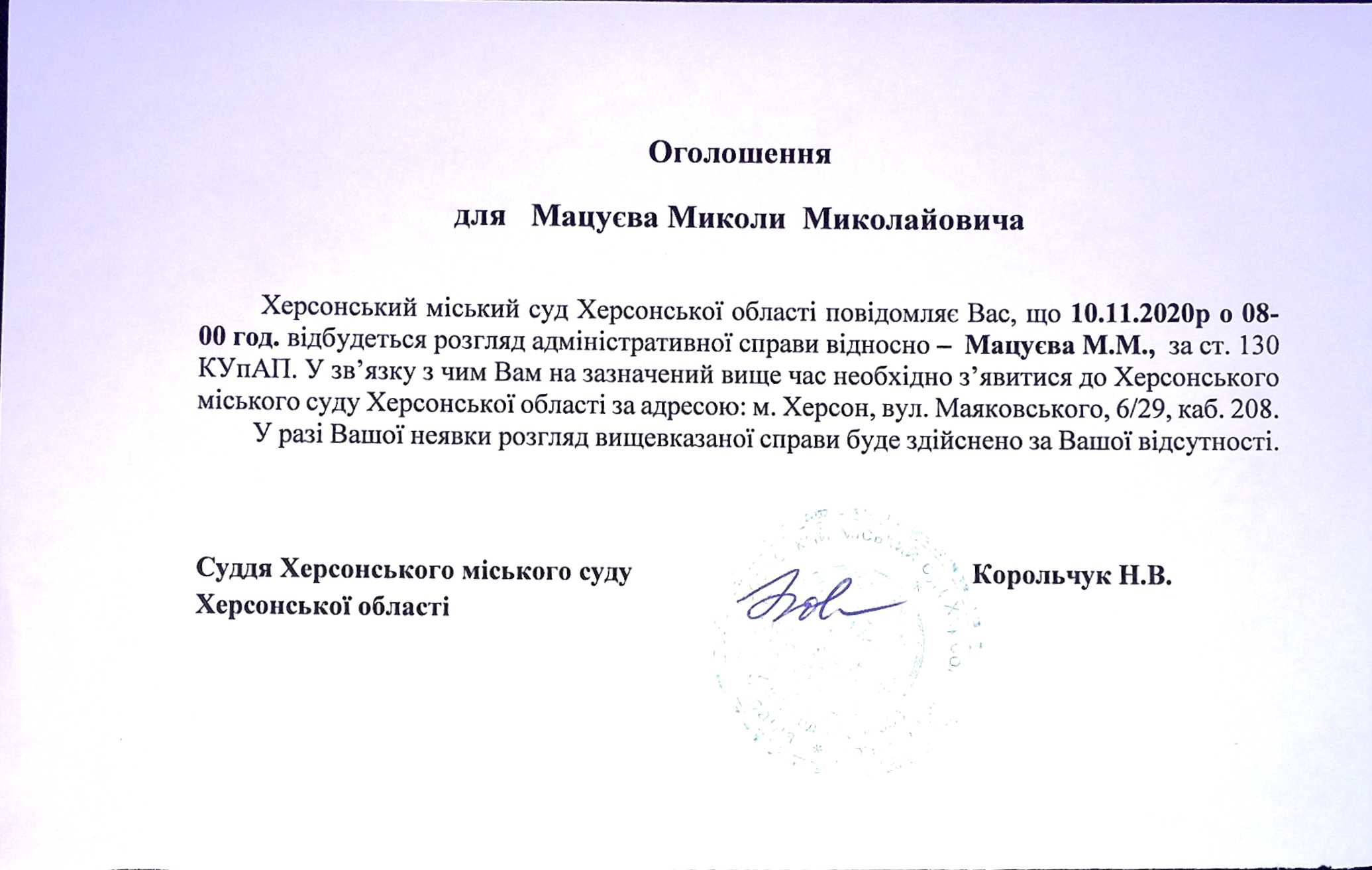 ОГОЛОШЕННЯ для Мацуєва Миколи Миколайовича