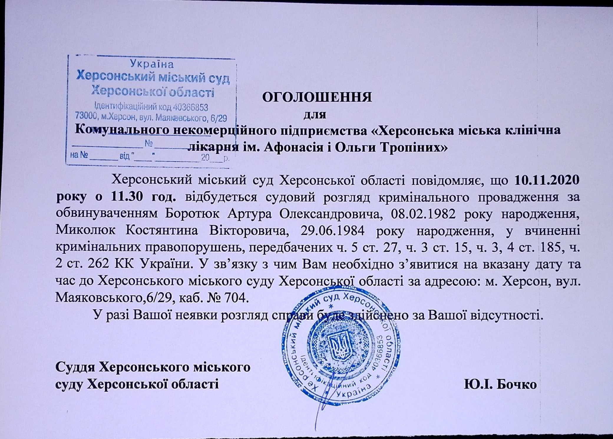 ОГОЛОШЕННЯ ПРО ВИКЛИК ДО СУДУ