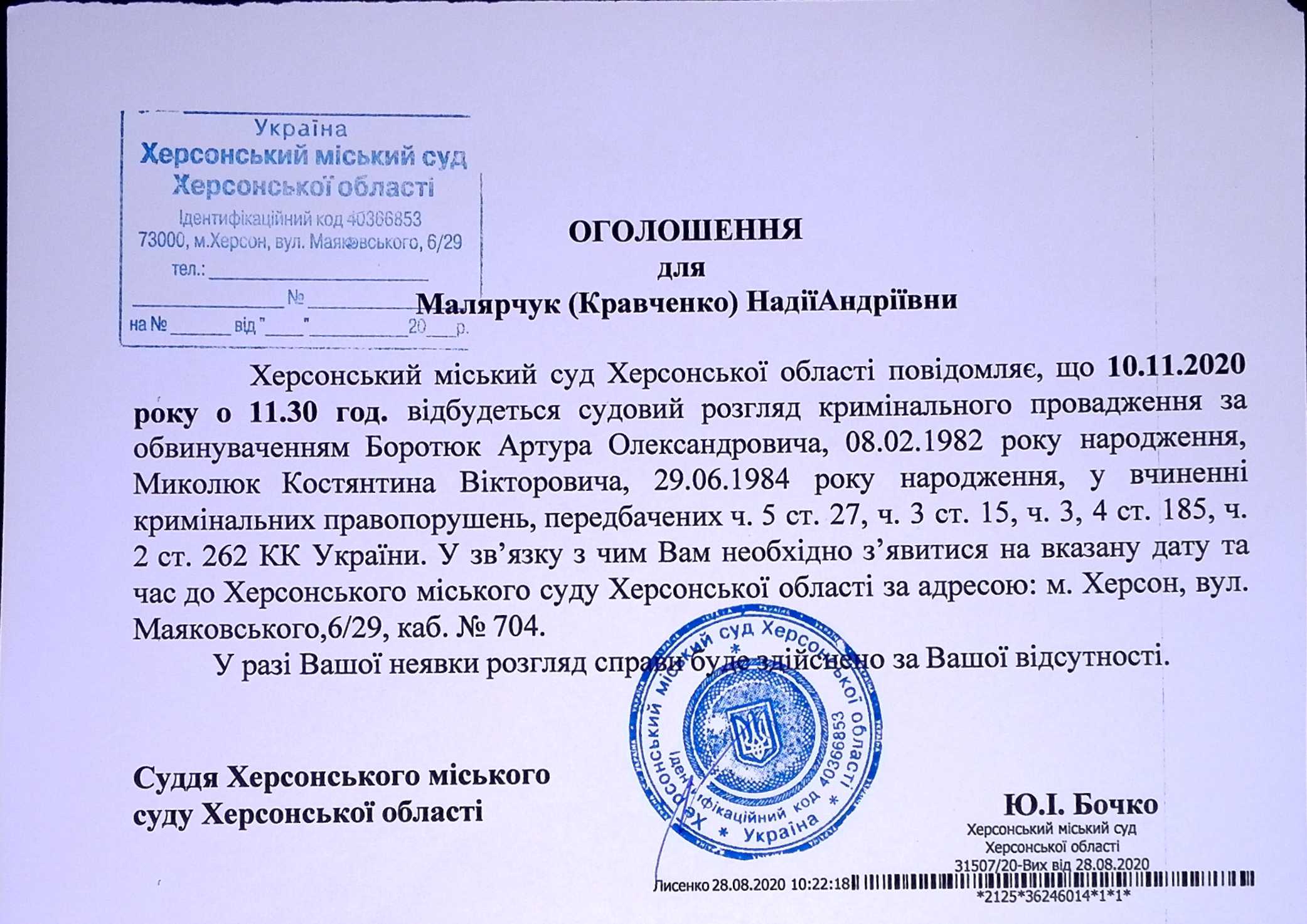ОГОЛОШЕННЯ ПРО ВИКЛИК ДО СУДУ