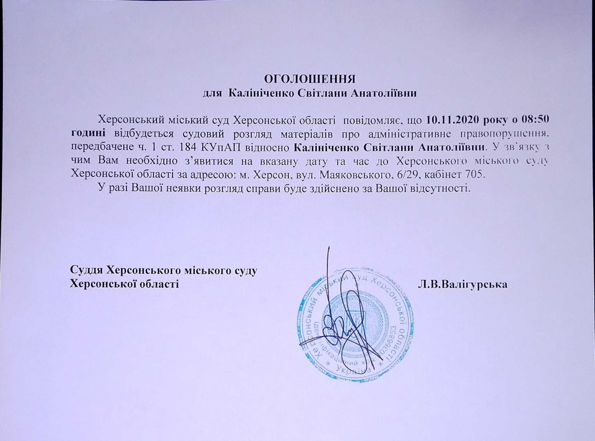ОГОЛОШЕННЯ для Калініченко Світлани Анатоліївни