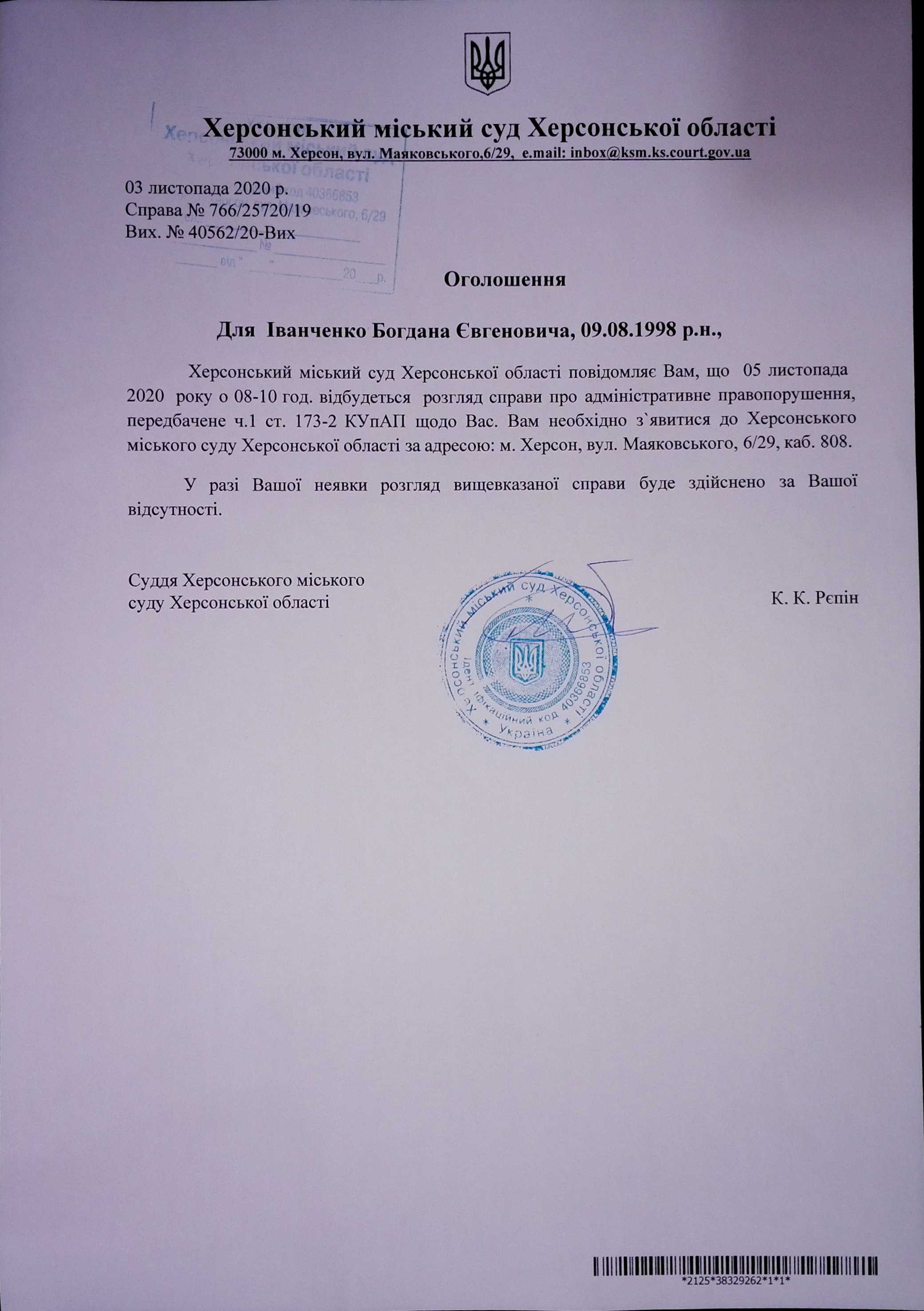 ОГОЛОШЕННЯ для Іванченко Богдана Євгеновича