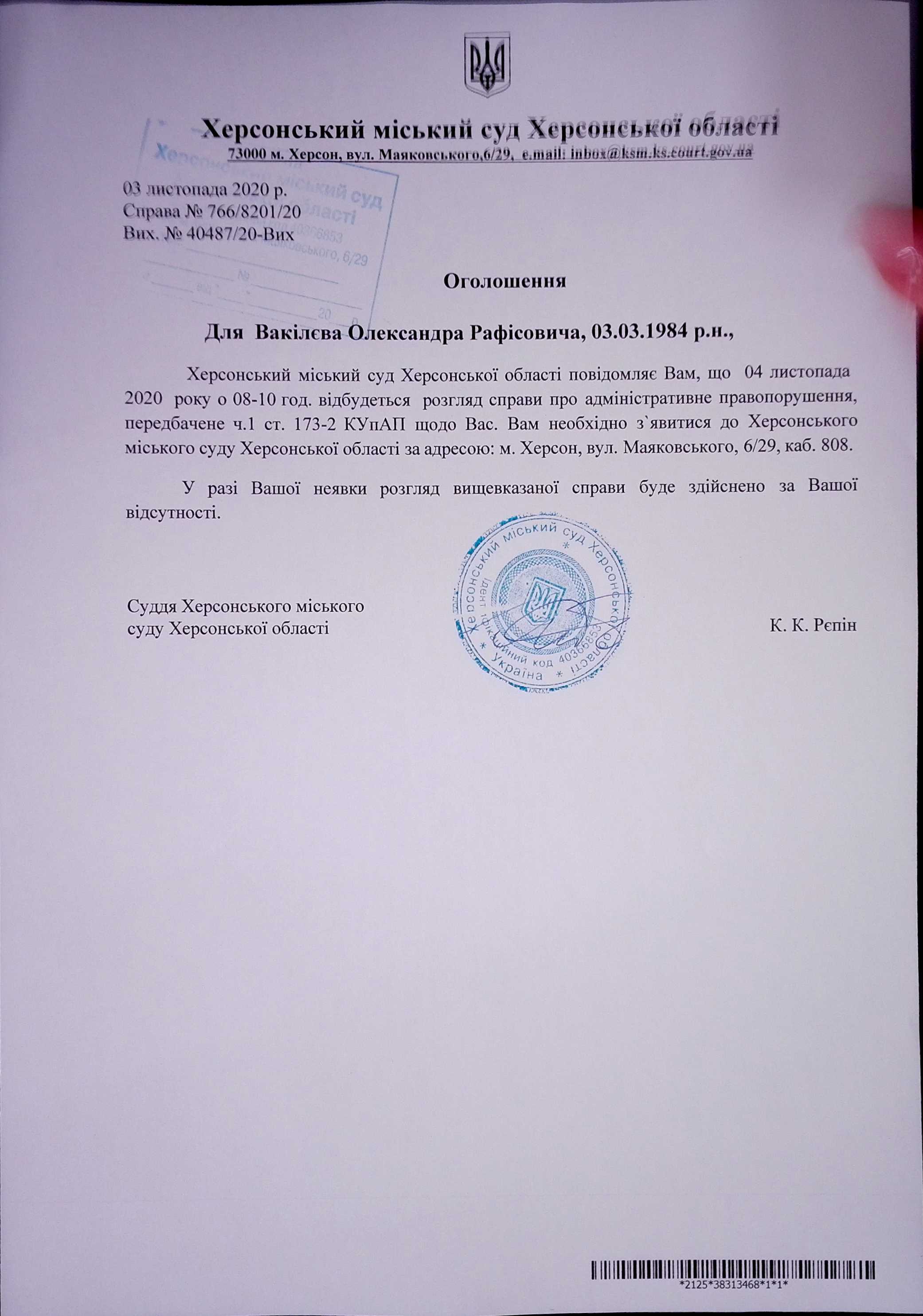ОГОЛОШЕННЯ ПРО ВИКЛИК ДО СУДУ