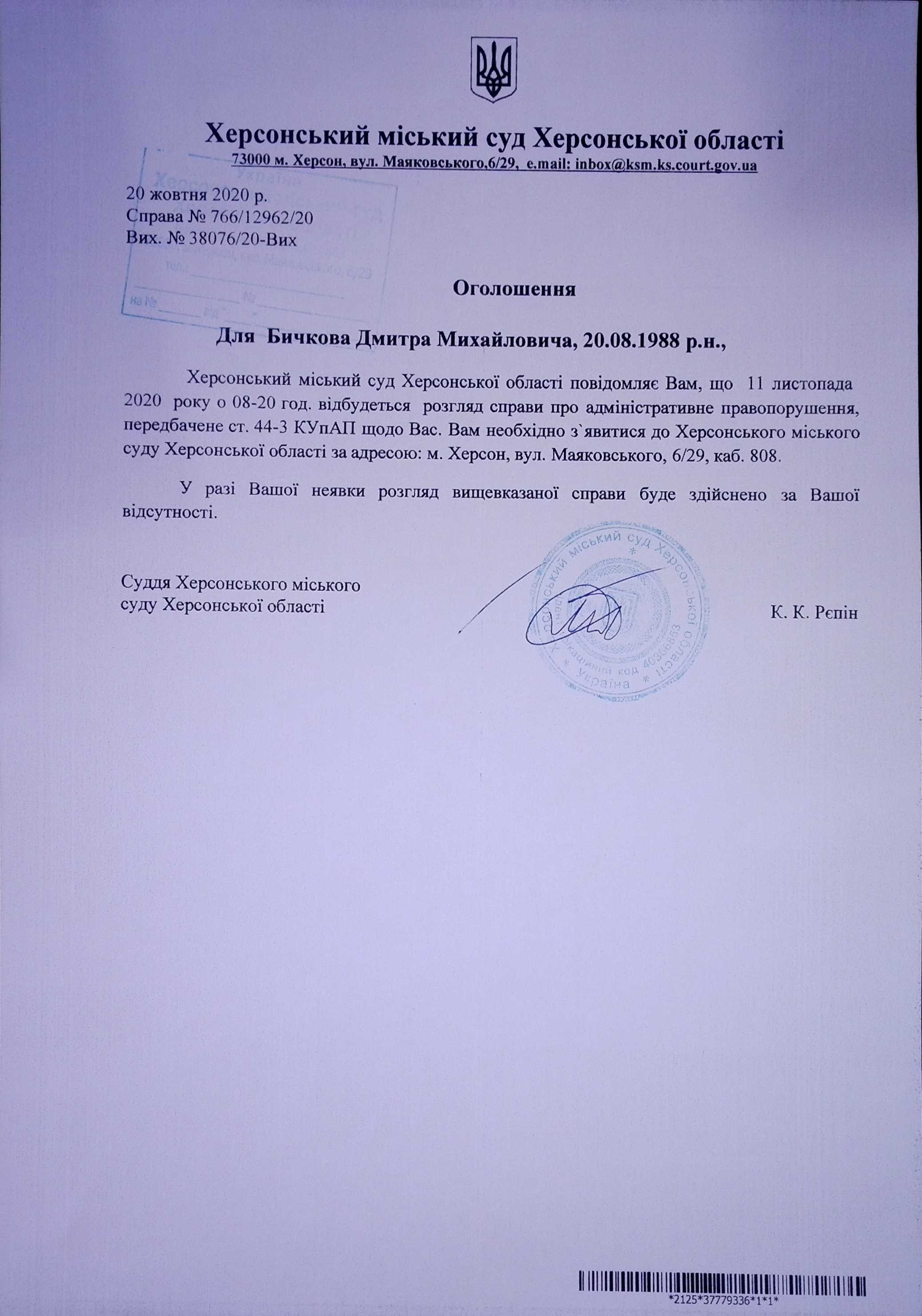 ОГОЛОШЕННЯ ПРО ВИКЛИК ДО СУДУ