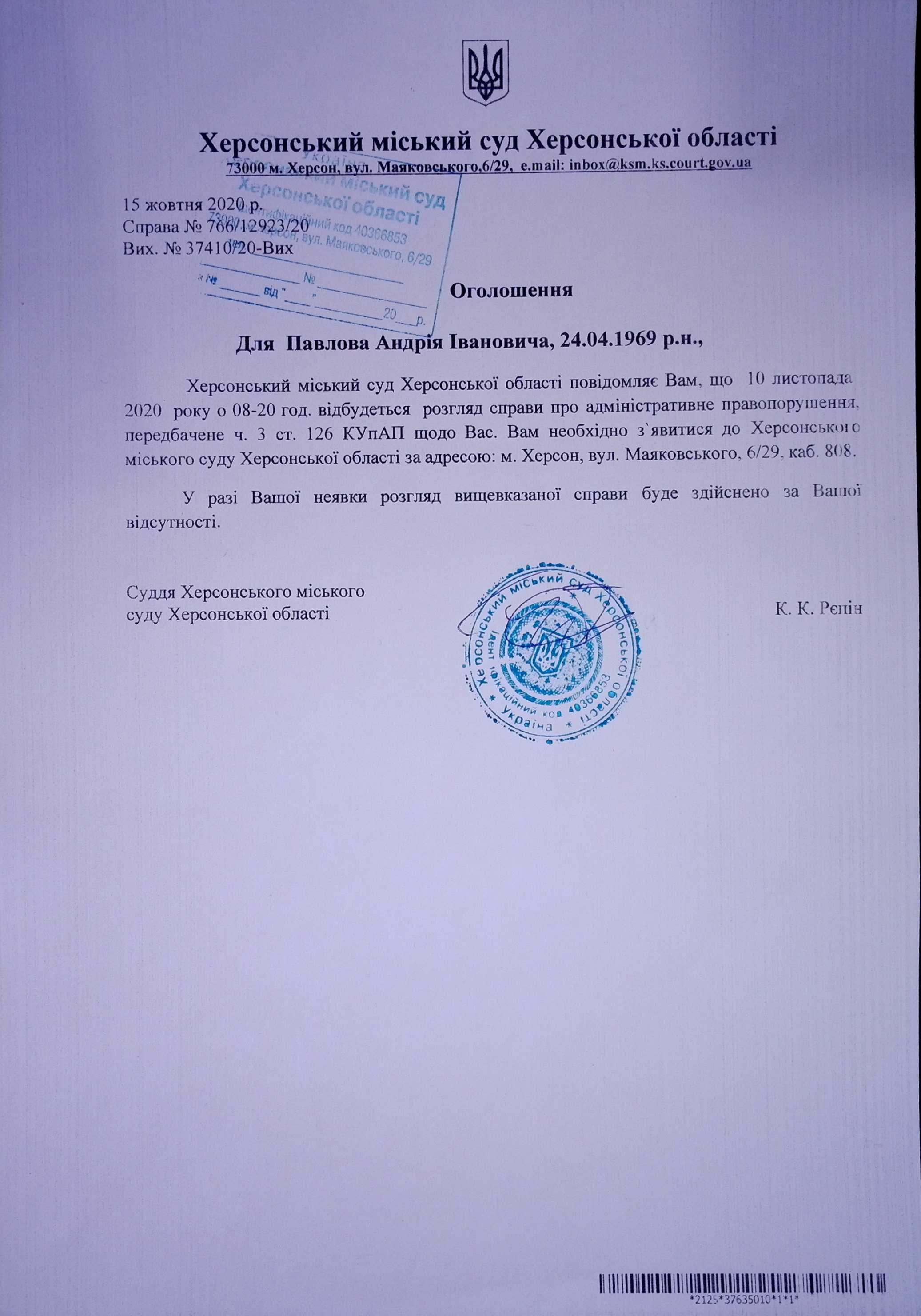 ОГОЛОШЕННЯ для Павлова Андрія Івановича