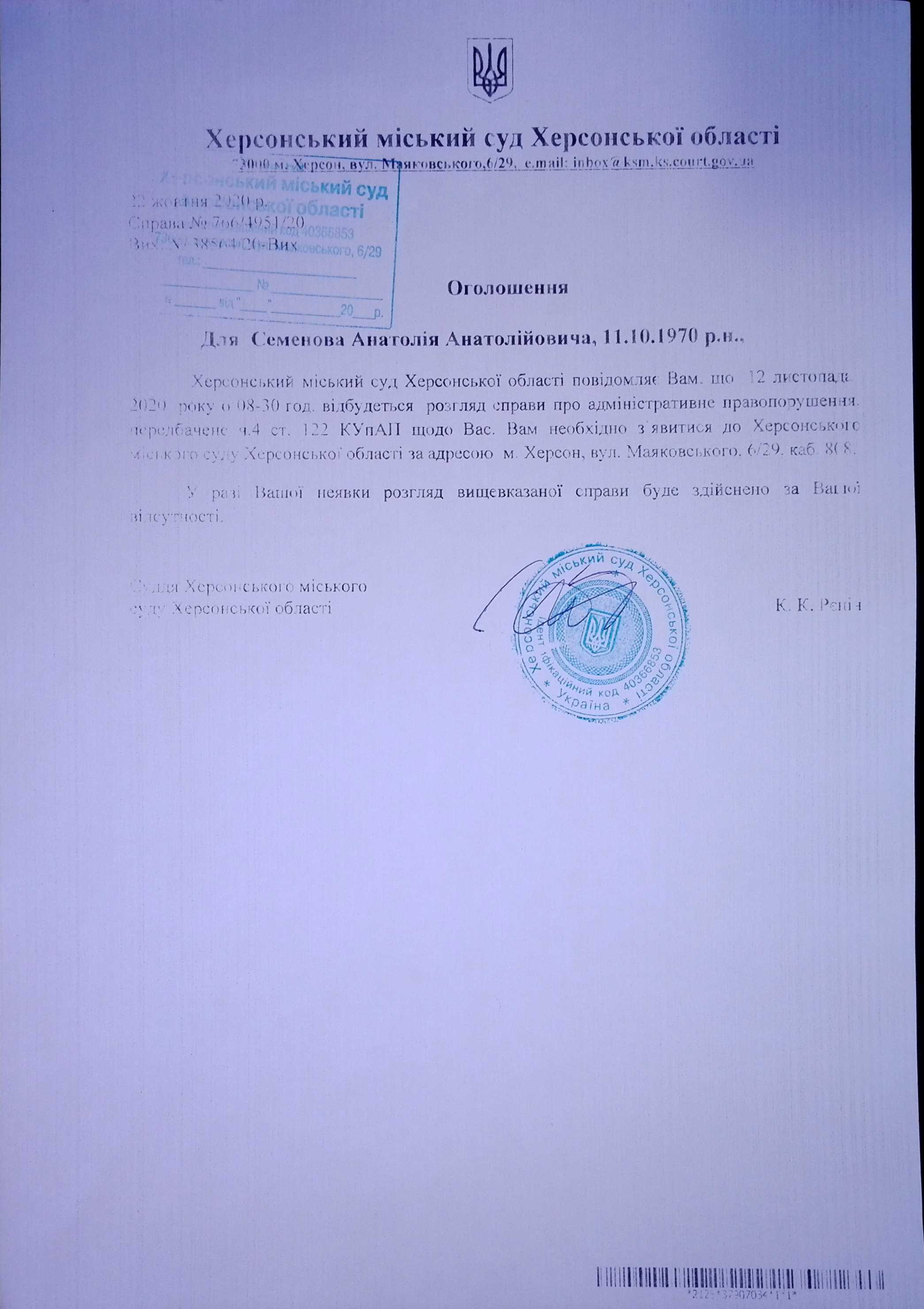 ОГОЛОШЕННЯ для Семенова Анатолія Анатолійовича