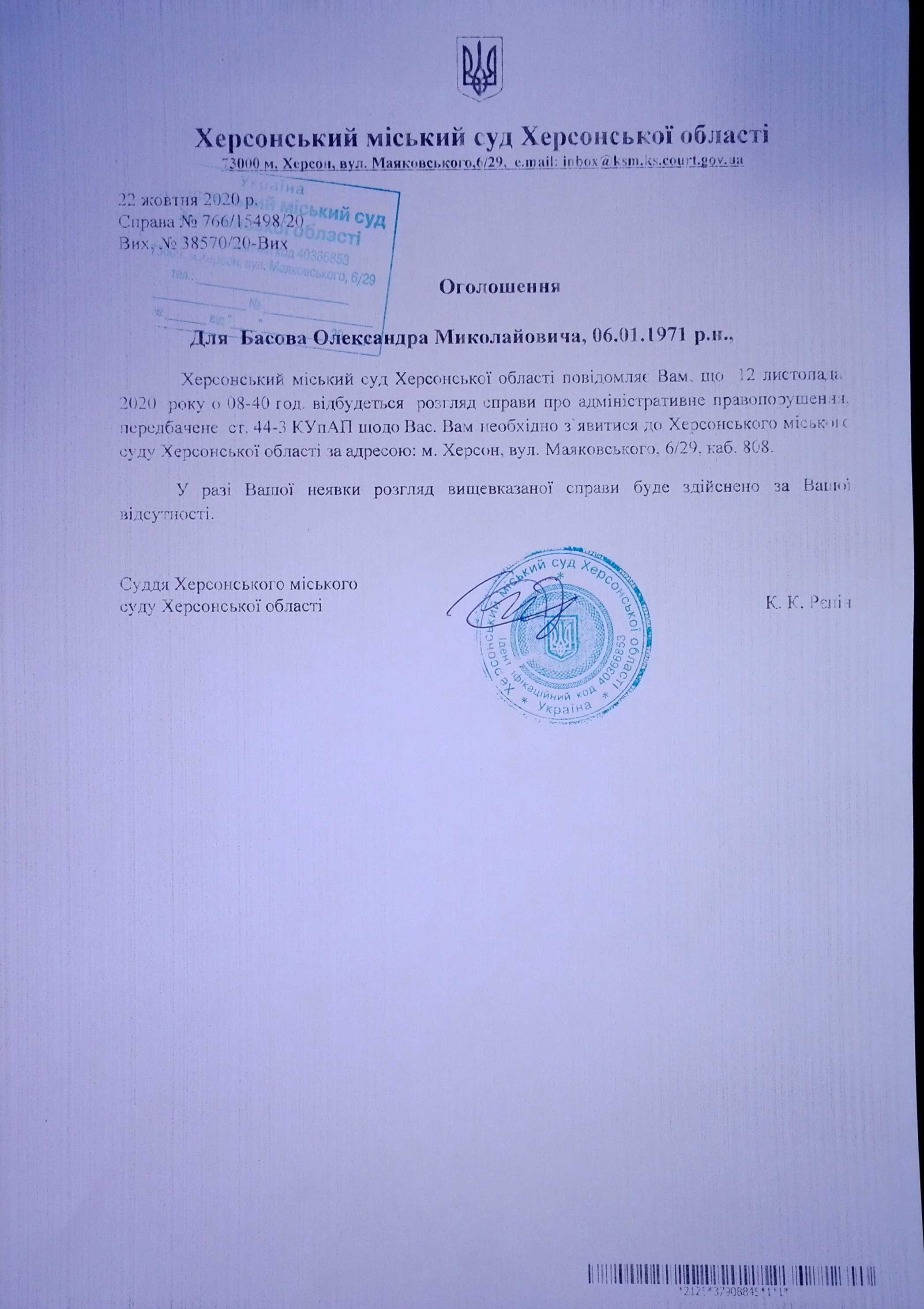ОГОЛОШЕННЯ для Басова Олександра Миколайовича