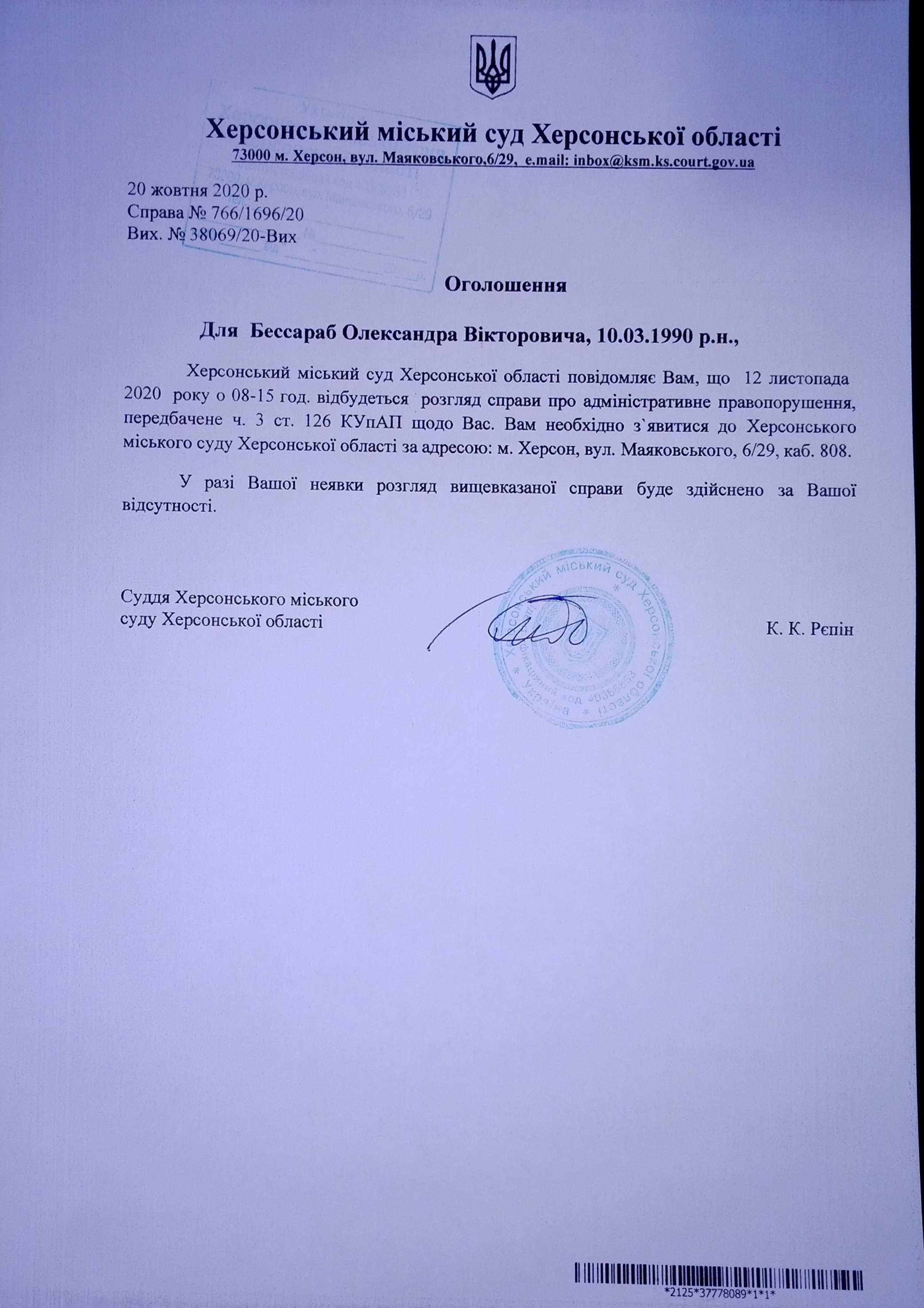 ОГОЛОШЕННЯ ПРО ВИКЛИК ДО СУДУ