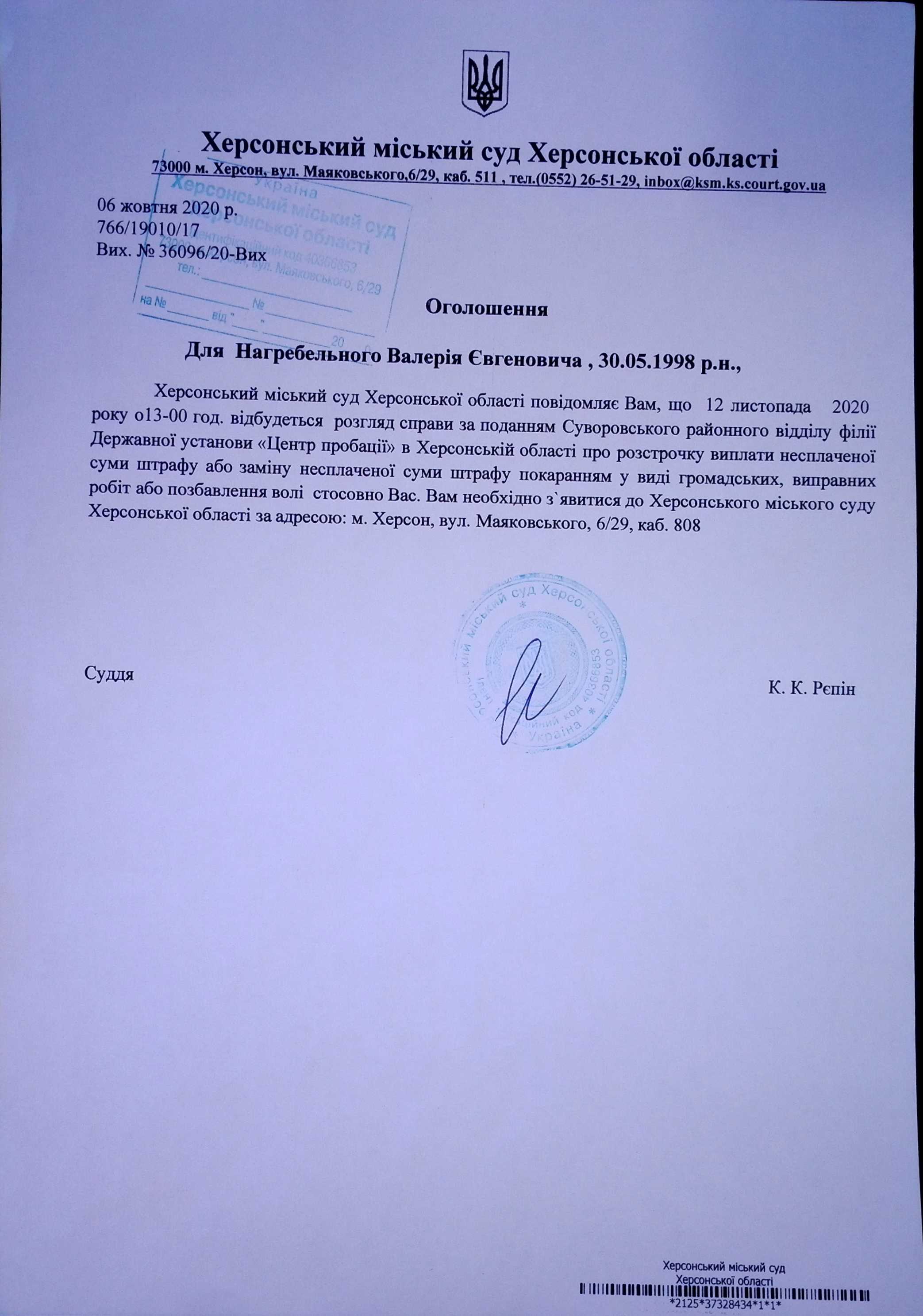 ОГОЛОШЕННЯ для Нагребельного Валерія Євгеновича