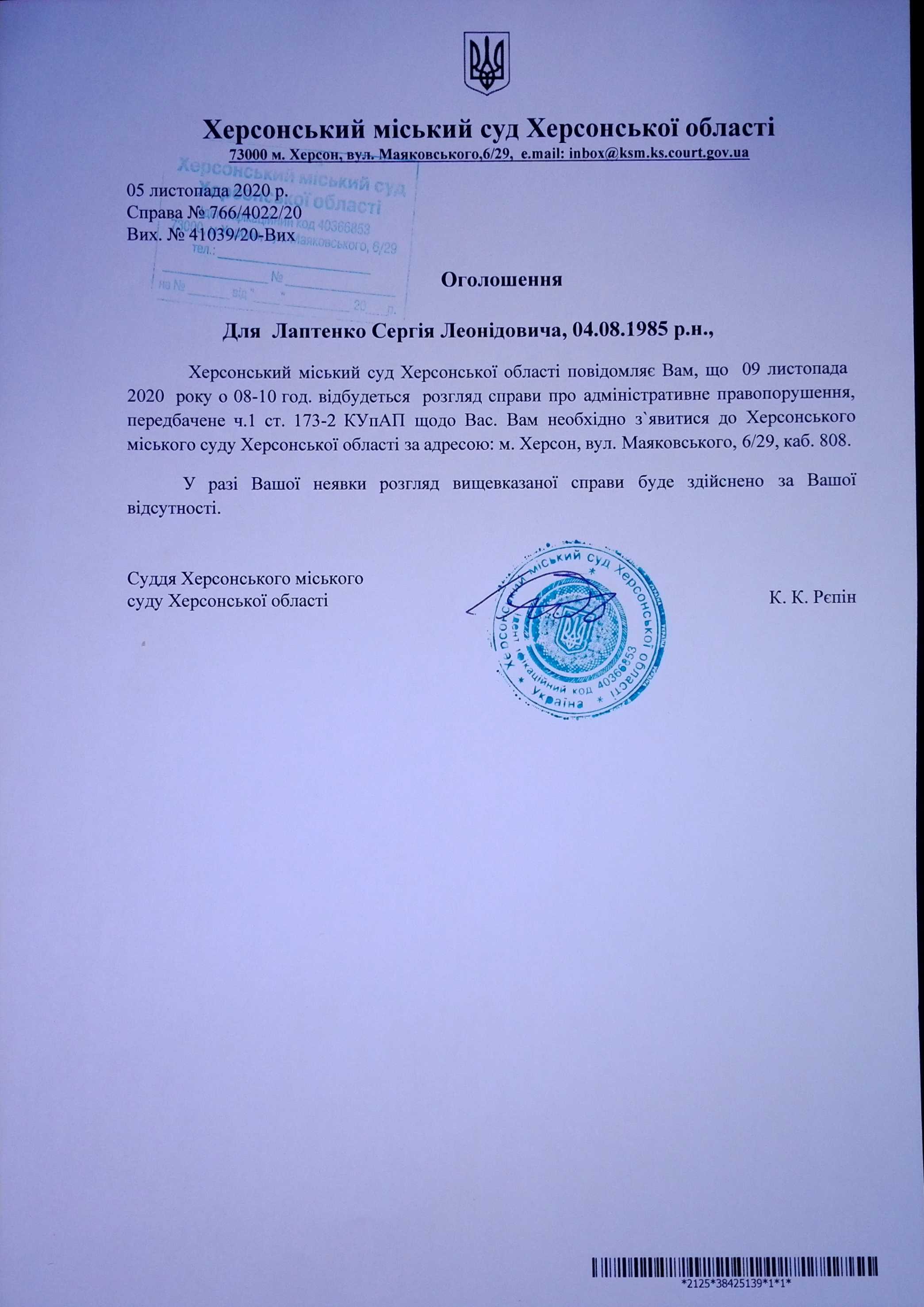 ОГОЛОШЕННЯ для Лаптенко Сергія Леонідовича