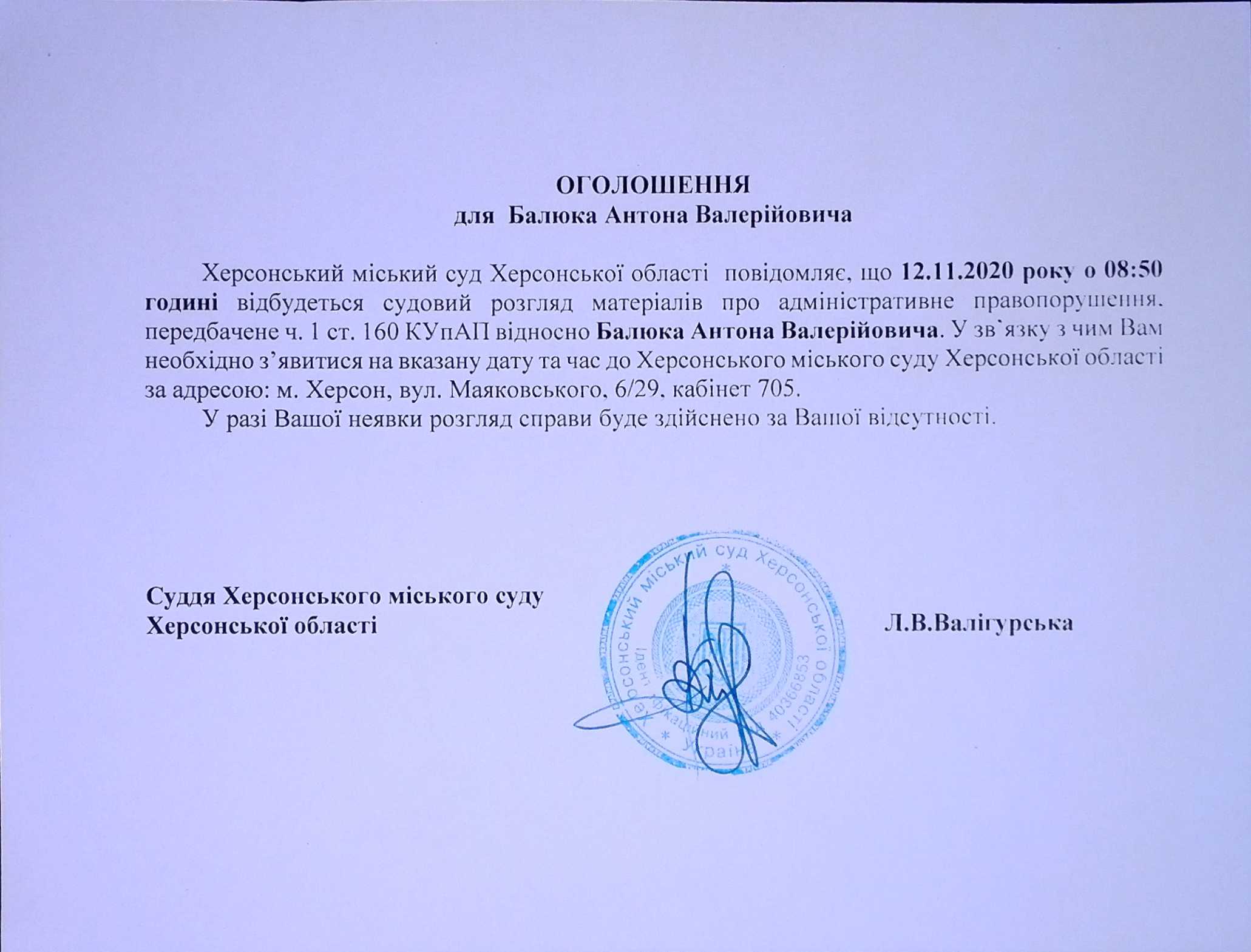 ОГОЛОШЕННЯ для Балюка Антона Валерійовича