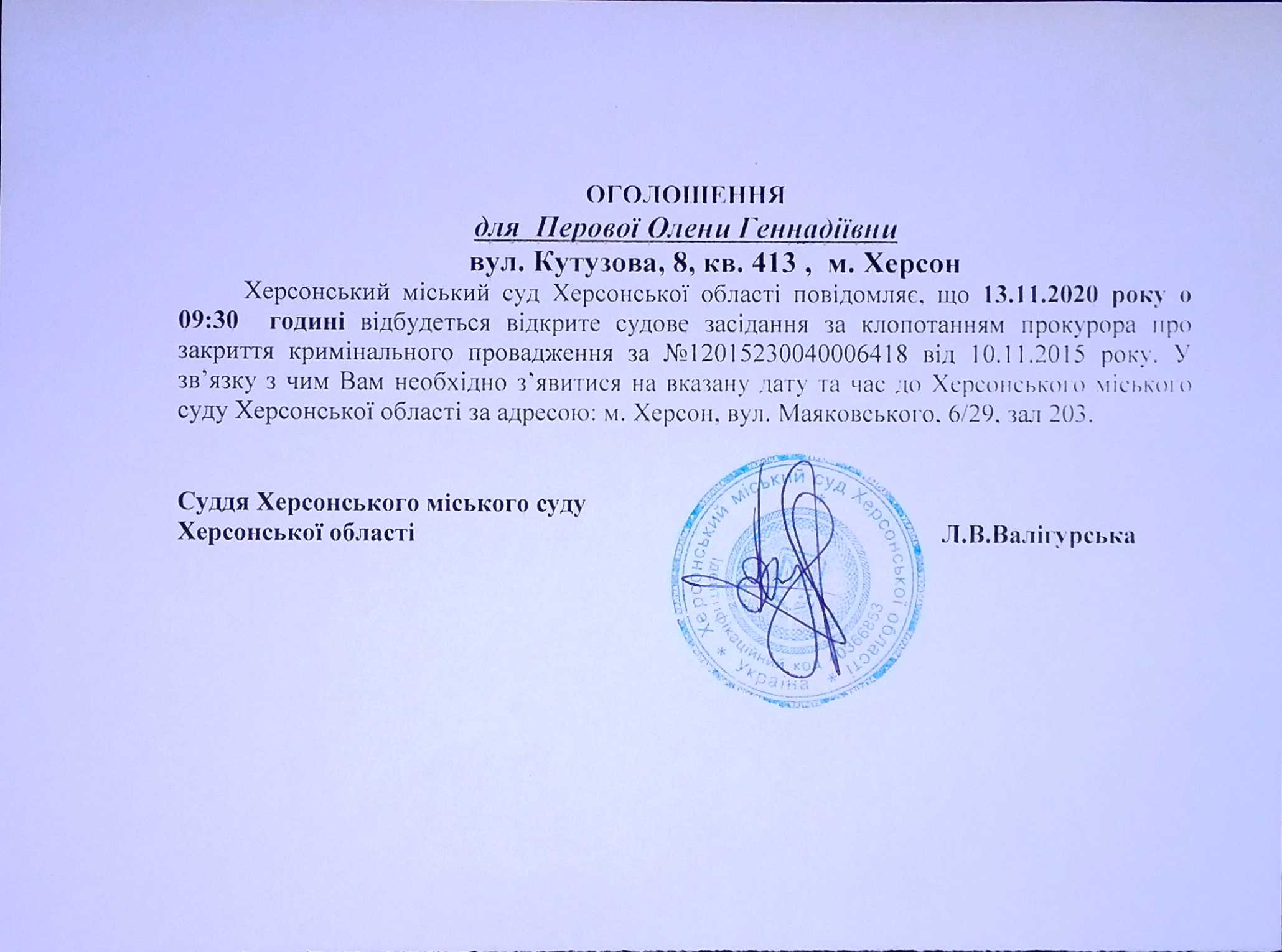 ОГОЛОШЕННЯ для Перової Олени Геннадіївни