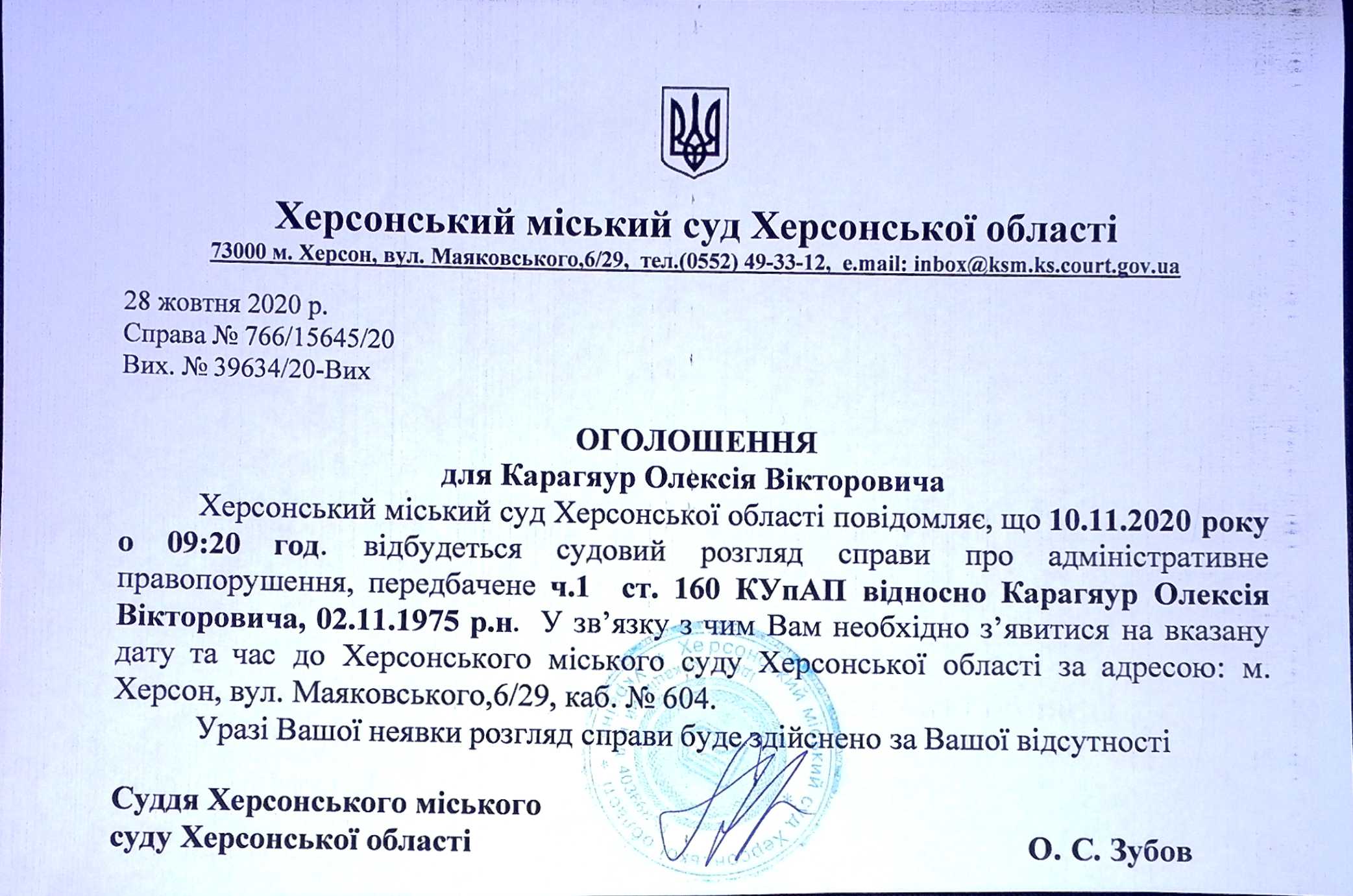 ОГОЛОШЕННЯ для Карагяур Олексія Вікторовича