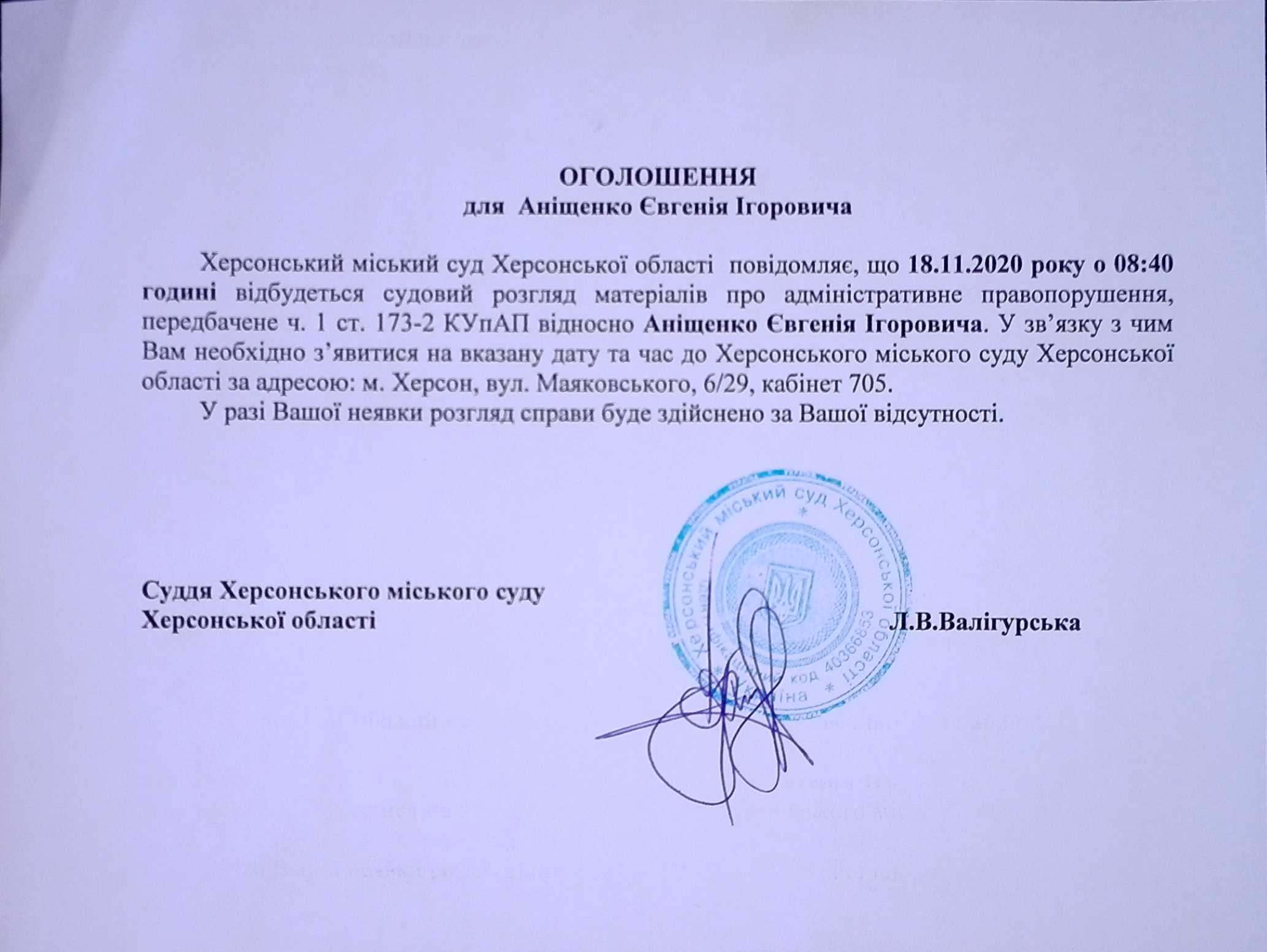 ОГОЛОШЕННЯ для Аніщенко Євгенія Ігоровича