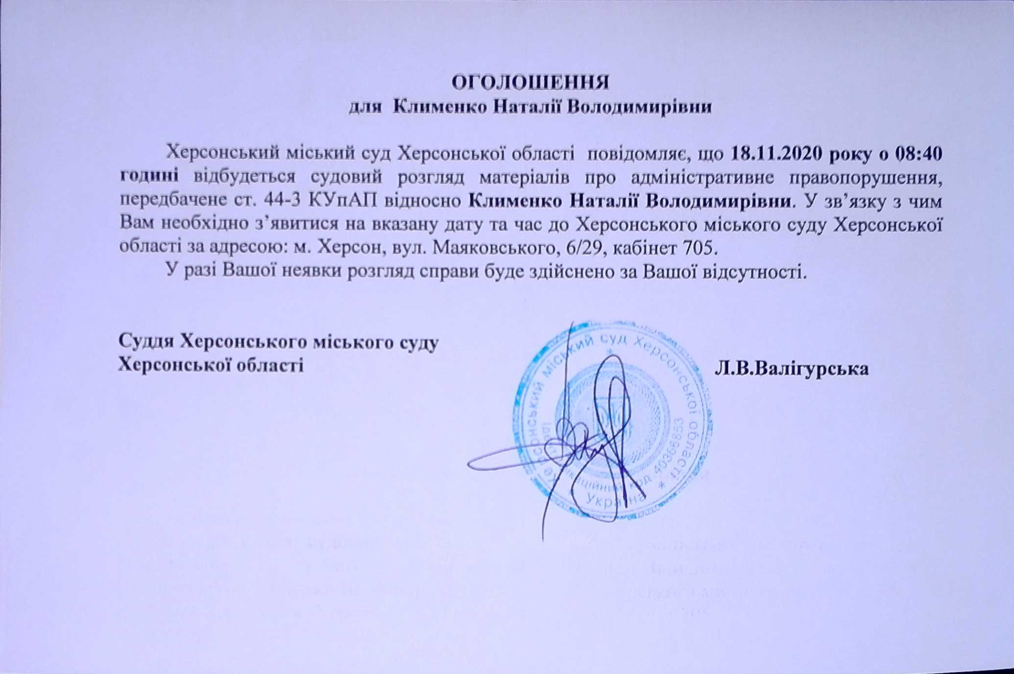 ОГОЛОШЕННЯ для Клименко Наталії Володимирівни