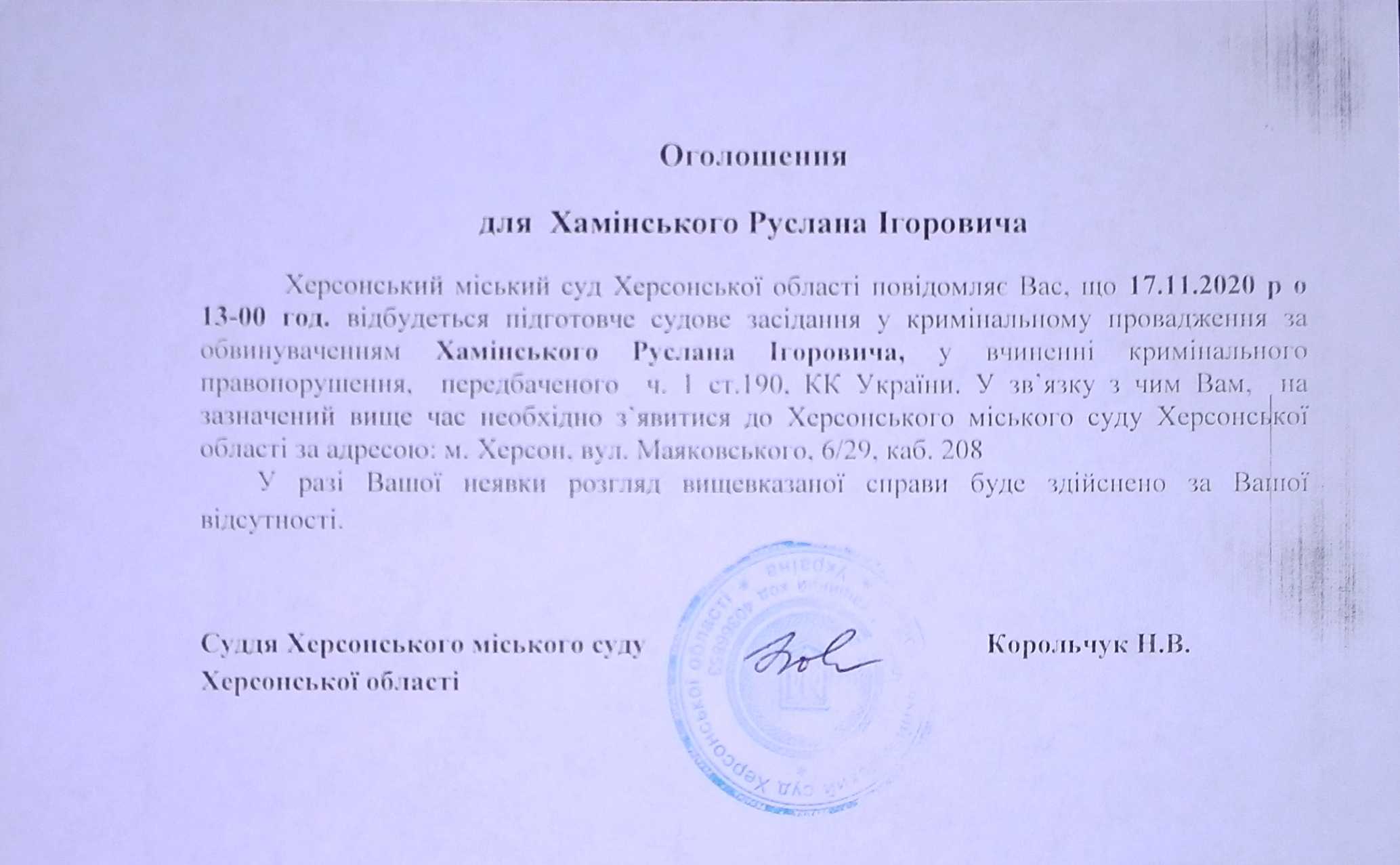 ОГОЛОШЕННЯ для Хамінського Руслана Ігоровича