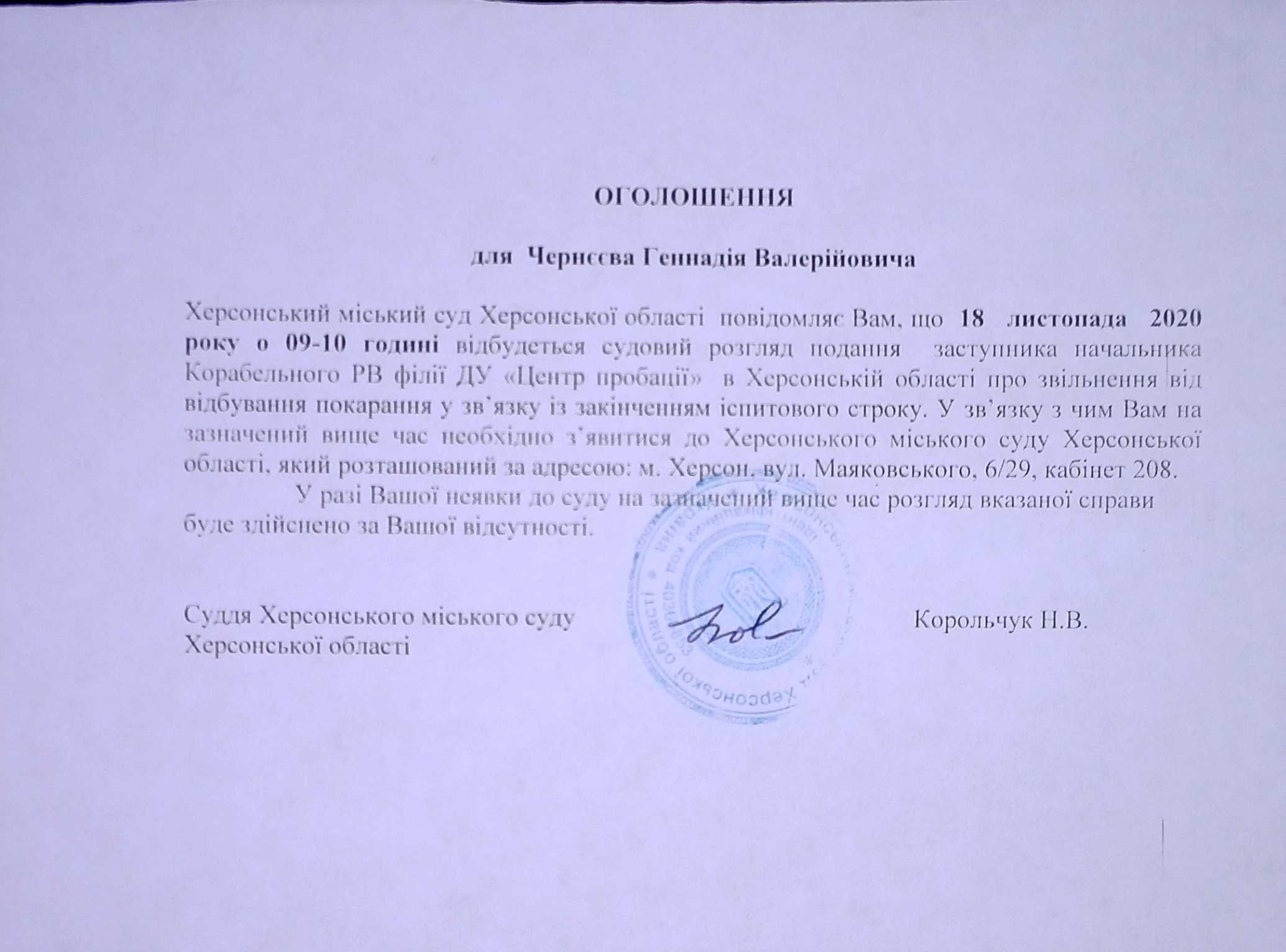 ОГОЛОШЕННЯ для Чернєєва Геннадія Валерійовича